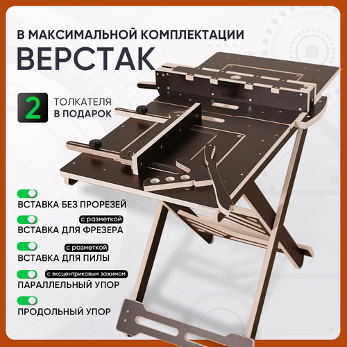 | Подробная комплектация | В комплект входят: Верстак складной Универсальная пластина с разметкой для фрезера Универсальная пластина с разметкой для циркулярной пилы Универсальная пластина без прорези ( для запила под углом 45*) Параллельный упор эксцентриковый, с отверстием для дополнительного пылеотвода и стружкоотсоса Продольный упор В подарок мы кладем набор толкателей (прямой толкатель и толкатель для циркулярной пилы) |