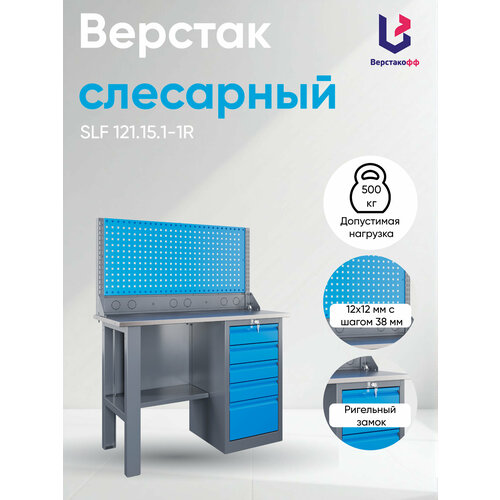 Основной особенностью рабочего места является наличие экрана для размещения навесного оборудования. Перфорация экрана изготовлена в размере 12х12 мм с шагом 38 мм. Помимо этого, слесарный верстак оснащён тумбой, предназначенной для хранения инструментов, запчастей и прочих необходимых мелочей для работы. Каркас верстака выполнен из холоднокатаной прочной стали, а его металлические поверхности окрашены покрытием краски, благодаря которой корпус защищён от коррозии. Под экраном расположен блок коммуникаций с отверстиями под розетки, с помощью которых можно будет подключать сетевое оборудование. Ящики слесарного верстака окрашены в RAL7037, ручки - в RAL9006, а основное исполнение корпуса выполнено в цвете RAL7037.