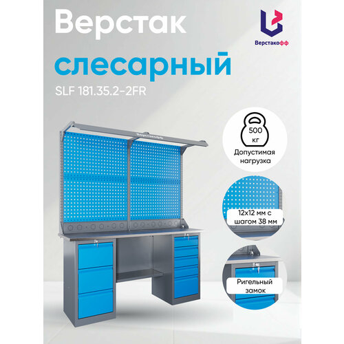 Основной особенностью рабочего места является наличие экрана для размещения навесного оборудования и освещения, с помощью которого выполнение работ будет комфортным и грамотным. Перфорация экрана изготовлена в размере 12х12 мм с шагом 38 мм. Помимо этого, слесарный верстак оснащён тумбами, предназначенными для хранения инструментов, запчастей и прочих необходимых мелочей для работы. Каркас верстака выполнен из холоднокатаной прочной стали, а его металлические поверхности окрашены покрытием краски, благодаря которой корпус защищён от коррозии. Под экраном расположен блок коммуникаций с отверстиями под розетки, с помощью которых можно будет подключать сетевое оборудование. Ящики слесарного верстака окрашены в RAL7037, ручки - в RAL9006, а основное исполнение корпуса выполнено в цвете RAL7037.