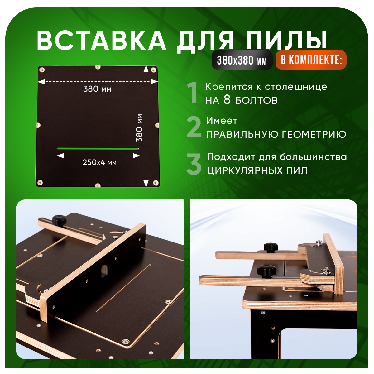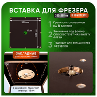 В комплекте: Вставка для фрезера 380 мм х 380 мм, имеет с обратной стороны, диаметром 200 мм, глубина 8 мм. - для максимального вылета фрезы. Готовый пропил под фрезу 45 мм