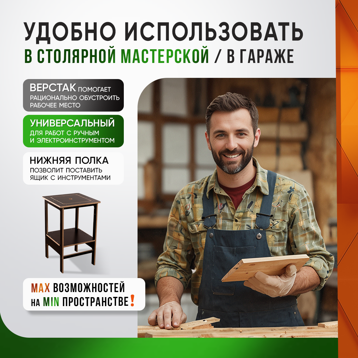 Правильно и грамотно сконструированный, современный верстак - компактный и функциональный. Фрезерно пильный стол будет незаменимым инструментом и помощником в небольшой столярной мастерской. Рабочий стол в гараж включает в себя большую функциональность, а именно может служить как фрезерный и распиловочный стол Верстак столярный и слесарный. имеет хорошую устойчивость благодаря дополнительным усилениям на ногах, при этом не теряя в функциональности, и не мешая столяру. Идеальный вариант полезного и практичного подарка хозяйственному мужчине (мужу, папе, дедушке, любимому) на день рождения, юбилей