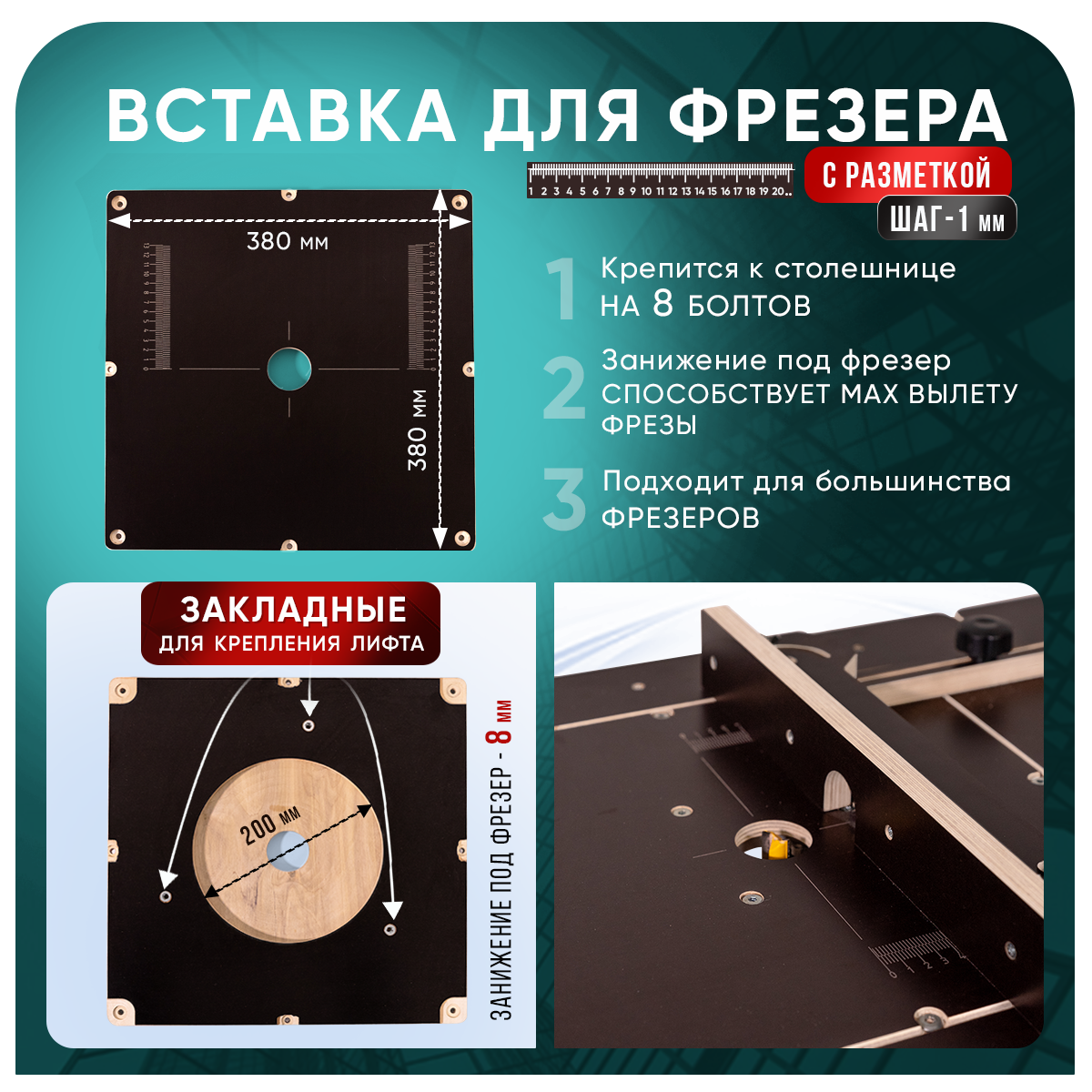Вставка с разметкой, для фрезера 380 ммх380 мм, имеет с обратной стороны, диаметром 200 мм, глубина 8 мм. - для максимального вылета фрезы. Готовый пропил под фрезу 45 мм