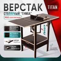 Верстак с вставками под фрезер и пилу в столешнице (с разметкой) Т-трек в столешнице 4 шт Элемент поддержки - 6 шт Параллельный упор эксцентриковый 1 шт "Барашки" фиксаторы в сложенном/разложенном виде - 4 шт Набор толкателей 2 шт (прямой толкатель и толкатель для циркулярной пилы)