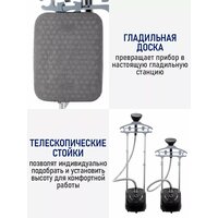 2700Вт, 2.2 л, время нагрева 35 сек, пар 35г/мин, 2 режима работы, время неприрывной работы 120 мин, индикатор работы, две телескопические стойки макс. длина 132 см, гибкий шланг 1,2м. Насадка-щетка, плечики для одежды с зажимом, термоперчатка в комплекте. Вертикальный напольный отпариватель 2700Вт, 2.2 л, время нагрева 35 сек, пар 35г/мин, 2 режима работы, время неприрывной работы 120 мин, индикатор работы, две телескопические стойки макс. длина 132 см, гибкий шланг 1,2м. Насадка-щетка, плечики для одежды с зажимом, термоперчатка. С его помощью Вы сможете легко отпарить белье или одежду, восстановить внешний вид ткани, меха или покрытия, осуществить плановый уход за любыми меховыми изделиями, а также произвести глубокую дезинфекцию, что особенно важно для здоровья детей. Вам больше не понадобится утюг, вы сэкономите время и электроэнергию, потому что вертикальный напольный отпариватель гладит в разы быстрее утюга. С ним Вы легко отпарите и отгладите белье или одежду любых типов, восстановите их форму и внешний вид, продезинфицируете любую вещь, включая детские игрушки, или покрытие. Бытовая техника для дома отпариватель вертикальный хороший подарок на новый год, новоселье или подарок на 8 марта маме. Отпариватель - парогенератор незаменимый помощник в каждом доме с ним глажка превращается в удовольствие. Паровая станция - ваш помощник в борьбе за аккуратность! Утюг для вертикального отпаривания - лучший выбор занятых людей! Вертикальный паровой утюг с мощностью и эффективностью. Одежда без морщин и заломов в любой ситуации. Вертикальный паровой утюг - надежный способ справиться с неприятной ситуацией. Удобство и простота в использовании! Экономия времени и сил! Паровая станция, вертикальный отпариватель, мощный отпариватель для дома