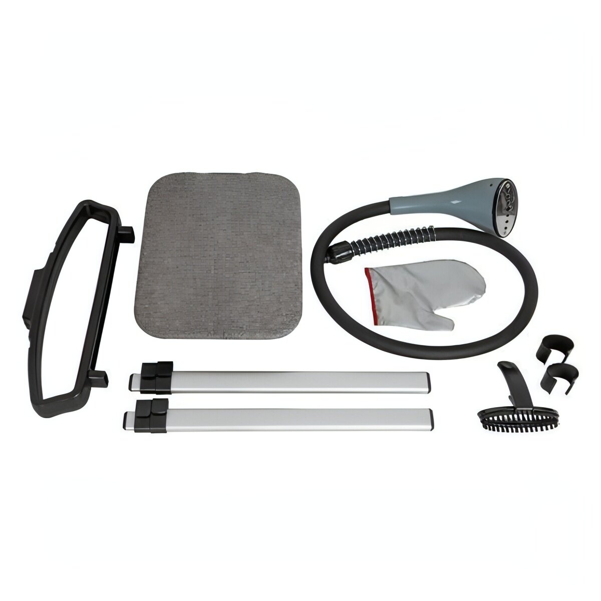Гибкий шланг в защитной тканевой оболочке, насадка-щетка с прищепкой для проглаживания стрелок, плечики для одежды, перчатка.