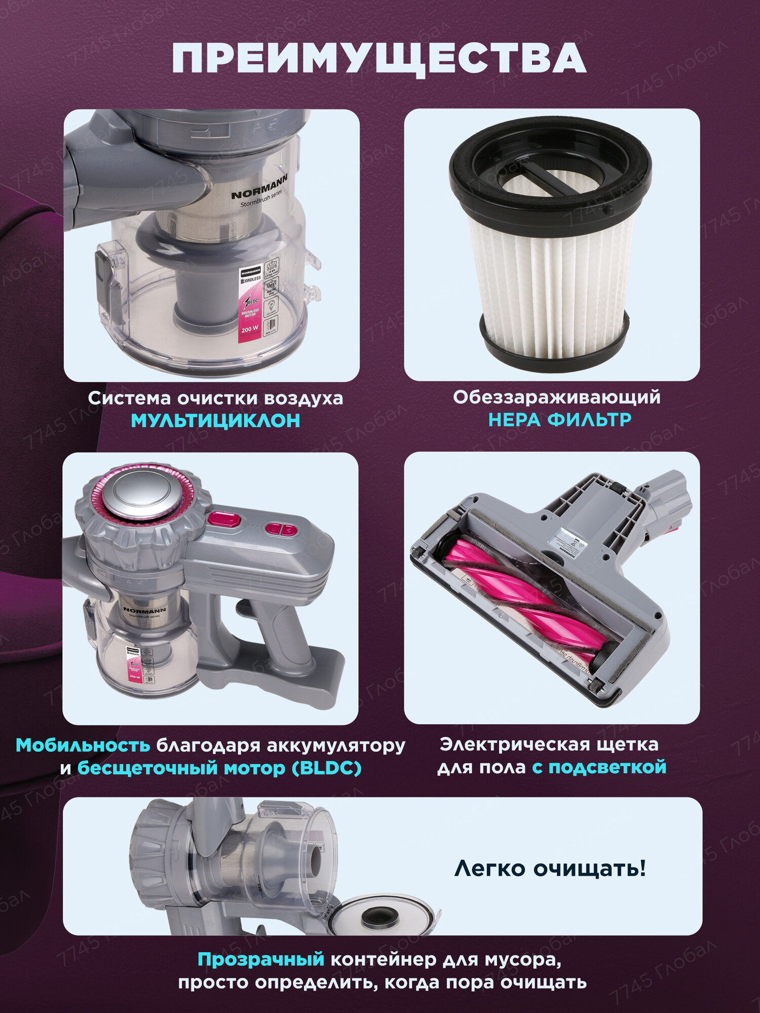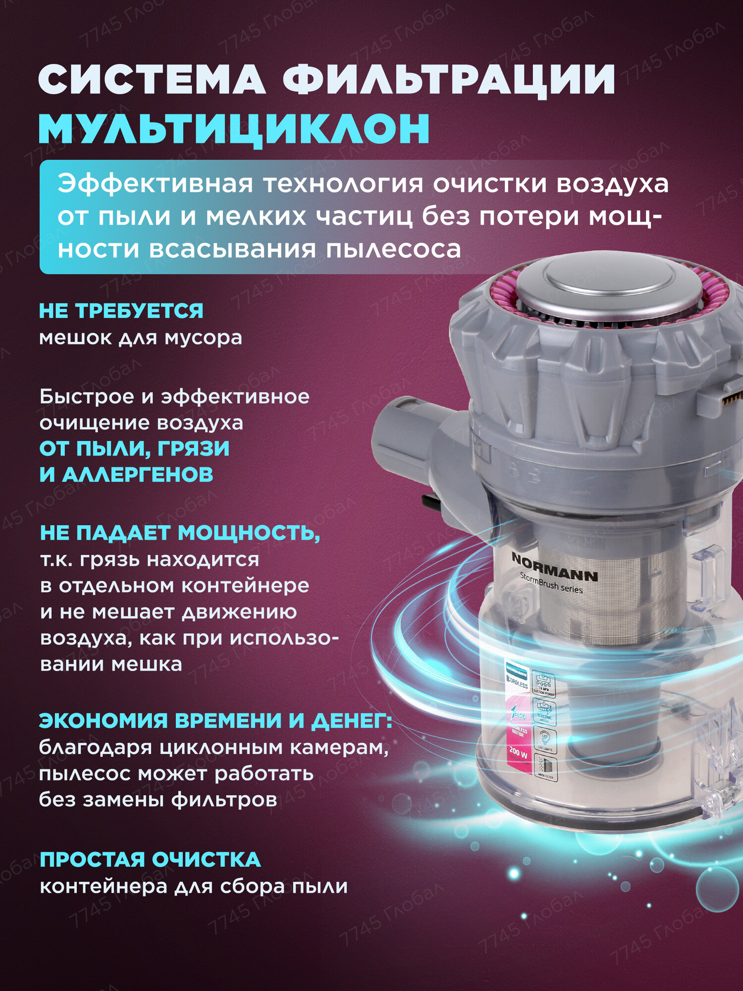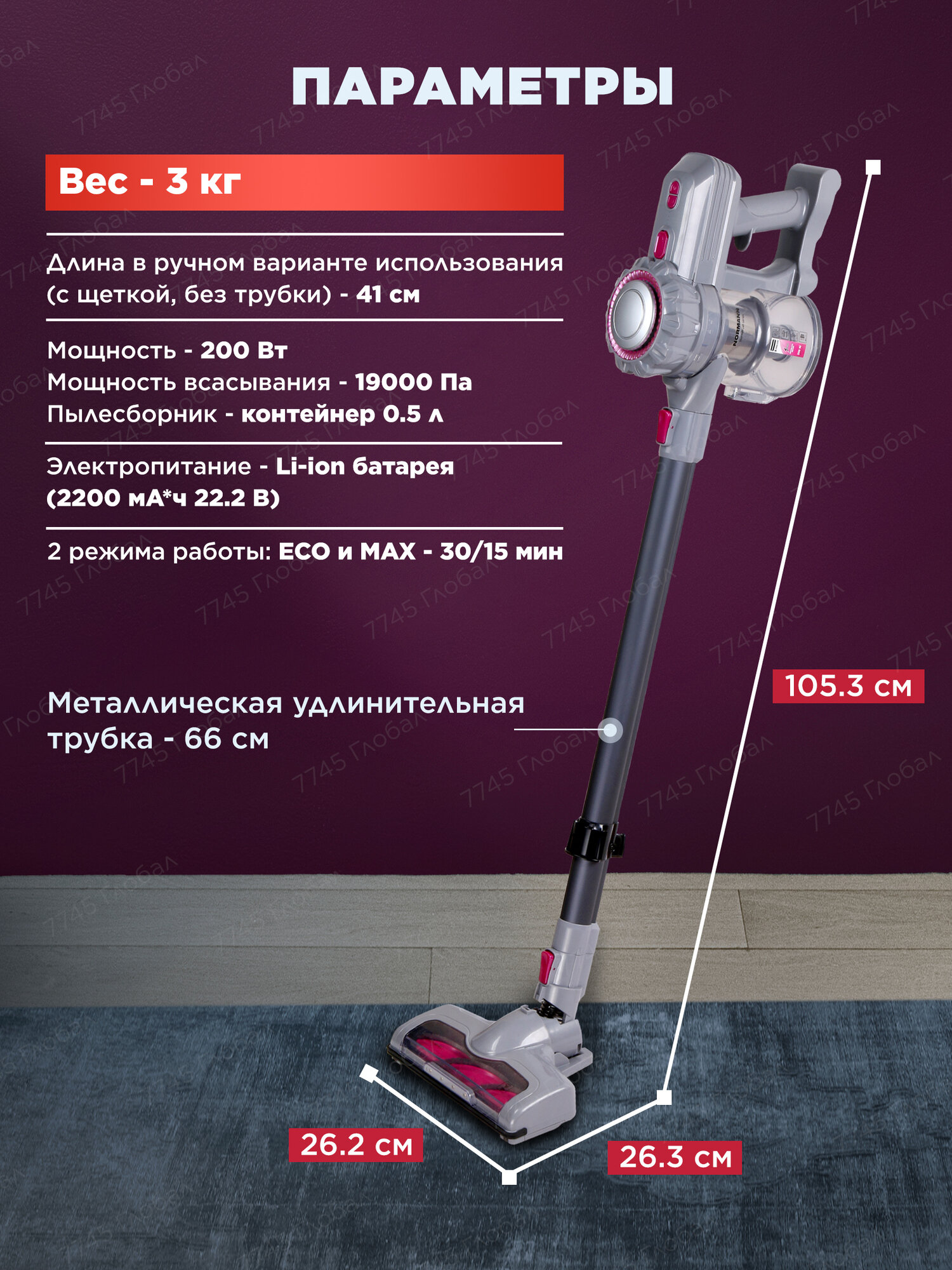 | Дополнительная информация | 2 режима: MAX (15 мин) и ECO (30 мин), Бесщеточный мотор BLDС, Система очистки воздуха "Мультициклон" |