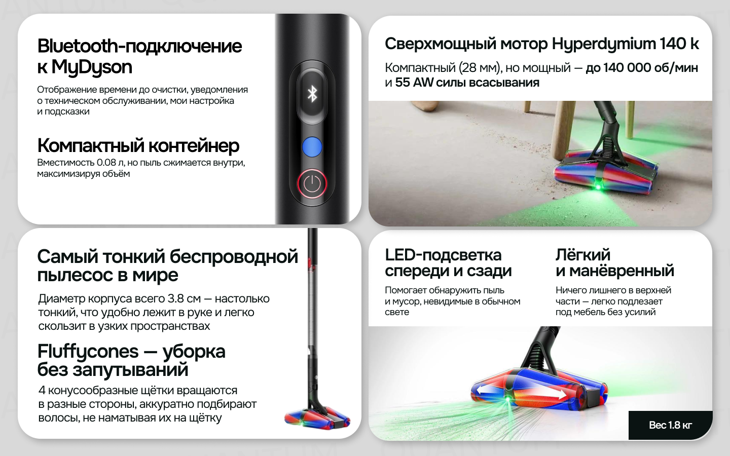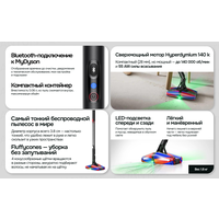 Dyson PencilVac SV50FF — сверхтонкий вертикальный пылесос для быстрых ежедневных задач. Корпус диаметром всего 38 мм и масса 1,3 кг делают уборку лёгкой: пылесос проходит между ножками мебели, достаёт под тумбы на высоте около 5 см. За сбор пыли отвечает компактная головка Micro Fluffy, которая бережно собирает крупный мусор и микропыль на твёрдых полах. Магнитная напольная док-станция служит аккуратным местом хранения и зарядки — пылесос всегда под рукой. Система фильтрации построена без циклонов: линейная двухступенчатая сепарация отделяет мусор и уплотняет его в контейнере Air-Compression Bin, а моющийся фильтр тонкой очистки удерживает 99,99% частиц размером от 0,3 мкм. Выброс пыли реализован шприцевым механизмом — содержимое выталкивается вниз, без облака пыли. Контейнер объёмом 0,08 л реже требует опустошения благодаря компрессии. dyson. co. jpДвигатель Hyperdymium 140k раскручивается до 140 000 об/мин, обеспечивая стабильную тягу. Три режима — Eco / Med / Boost — позволяют настроить мощность под задачу: от деликатной ежедневной уборки до точечной. От одного заряда пылесос работает до 30 минут (Eco с немоторизованной насадкой), полная зарядка занимает около 3,5 часов. В комплекте — Micro Fluffy, щелевая насадка с щёткой, магнитная зарядная станция и адаптер питания.