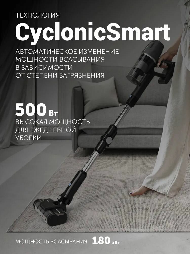 | Особенности конструкции | вертикальная парковка, индикатор заполнения пылесборника, место для хранения насадок, регулятор мощности на корпусе, управление мощностью на рукоятке, функция самоочистки |