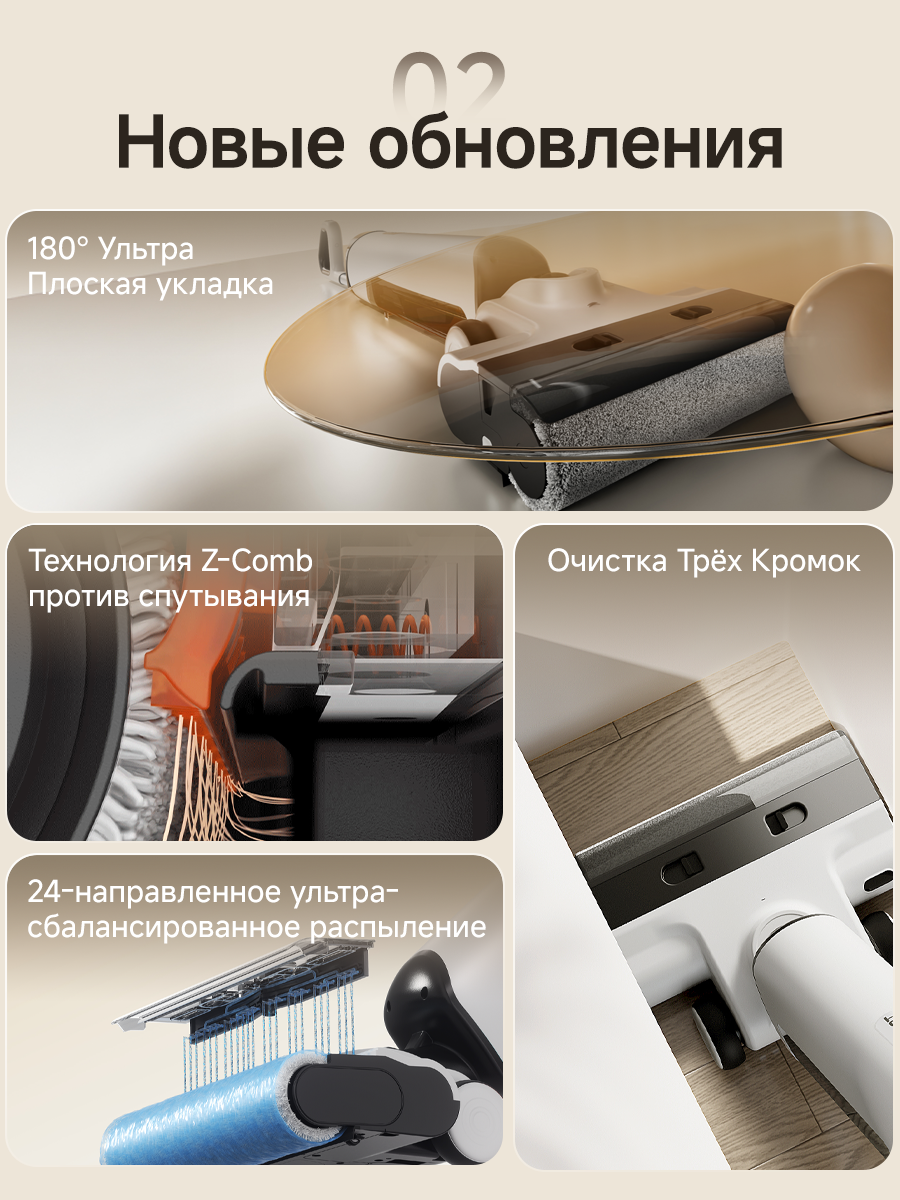 Он складывается на 180° и имеет высоту 13,5 см, что позволяет ему легко помещаться под кроватями, столами и в других низких местах. Его трехсторонняя конструкция кромок позволяет проникать в углы для удаления пыли, частиц, волос и грязи. А благодаря возможности уборки в полностью горизонтальном положении (180°), он обеспечивает тщательную и безупречную уборку по всему дому, экономя ваше время и силы.