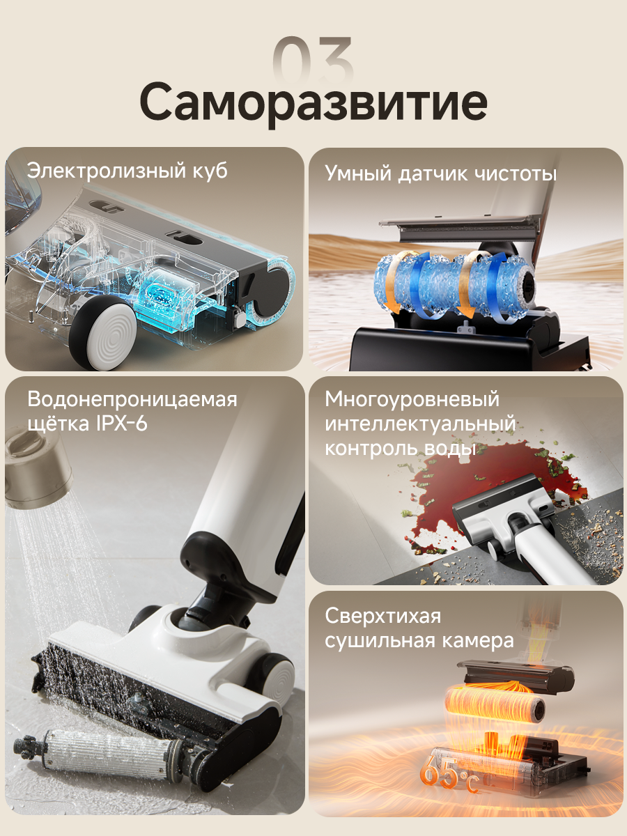 Пылесос для сухой и влажной уборки UWANT D500 использует многоуровневый подход для устранения запахов на протяжении всего рабочего цикла. Это включает в себя использование дезодорирующего стержня в резервуаре для сточных вод, самоочистку с помощью искусственного интеллекта одним нажатием кнопки, бесшумную сушку горячим воздухом при температуре 65°C и генерацию электролизованной воды в режиме реального времени. Эти функции работают вместе, обеспечивая длительную антибактериальную и дезодорирующую защиту.