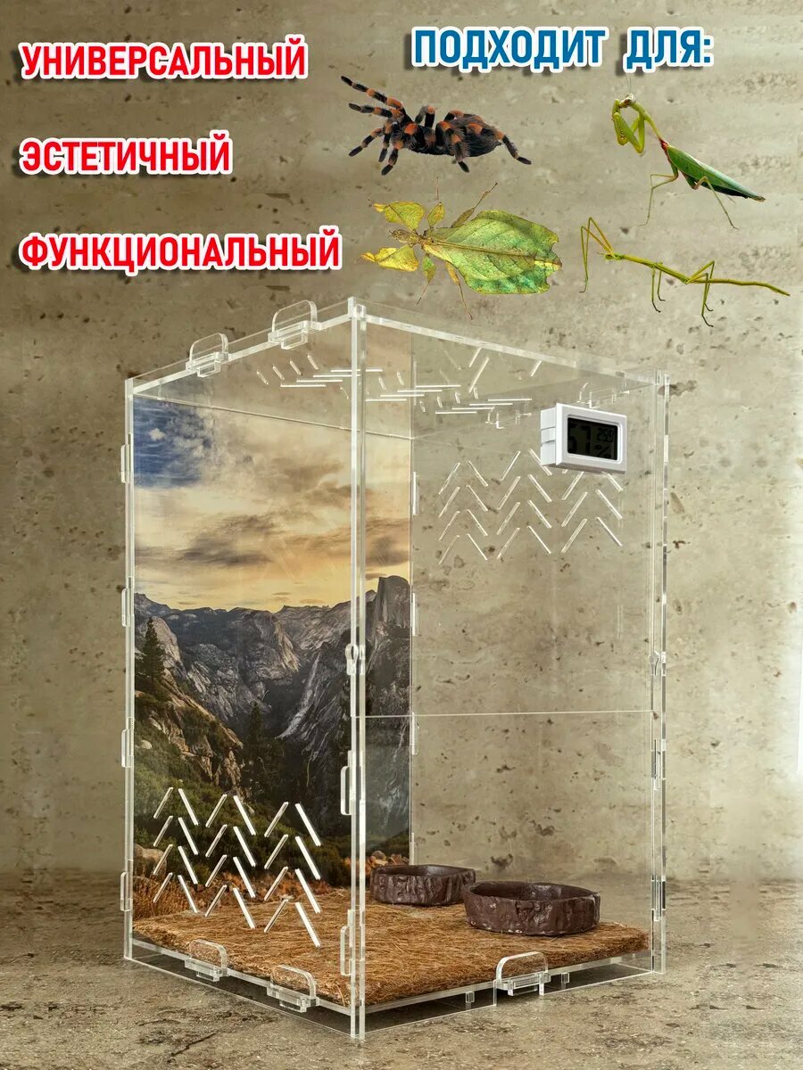 Этот разборный вертикальный террариум из акрила выделяется особо прочным акрилом толщиной 3 мм — в 13 раз прочнее обычного стекла. Благодаря кристально прозрачным стенкам вы сможете наблюдать за питомцем в комфортных условиях. В комплекте уже есть встроенный термогигрометр для точного контроля температуры и влажности, и батарейки для него включены. Бокс для экзотических животных с системой вентиляции и механически фиксируемой съемной крышкой легко собирается без клея и быстро разбирается, что делает его идеальным домом для рептилий, пауков, насекомых и других мелких животных. Продуманная вентиляция с прорезями шириной 1,5 мм обеспечивает приток свежего воздуха и поддержания оптимального микроклимата. Размеры: внешние 200х200х300 мм, внутренние 186х186х281 мм. Полезный объём 9,8 литров. Дно усилено дополнительными пластинами, что гарантирует отсутствие щелей и провисания. В комплекте — красочный фон (который можно заменить), кокосовый коврик, кормушка, поилка — всё для комфортного содержания. Террариум для рептилий и насекомых идеально подойдет для гекконов, хамелеонов, змей, пауков и скорпионов предпочитающих вертикальные поверхности, богомолов, палочников, листовидок, листоносок (Phylliidae), кормовых сверчков, сверчков-цикад (для кормления) и даже улиток ахатин и виноградных улиток. Таким образом вертикальный аквариум подходит в первую очередь для видов с вертикальной ориентацией поведения и требует продуманного обустройства среды. Также можно использовать как флорариум для тропических растений. Создайте настоящий живой уголок и идеальный дом для вашего питомца — удобный, практичный и функциональный акриловый террариум, который легко чистить и контролировать.