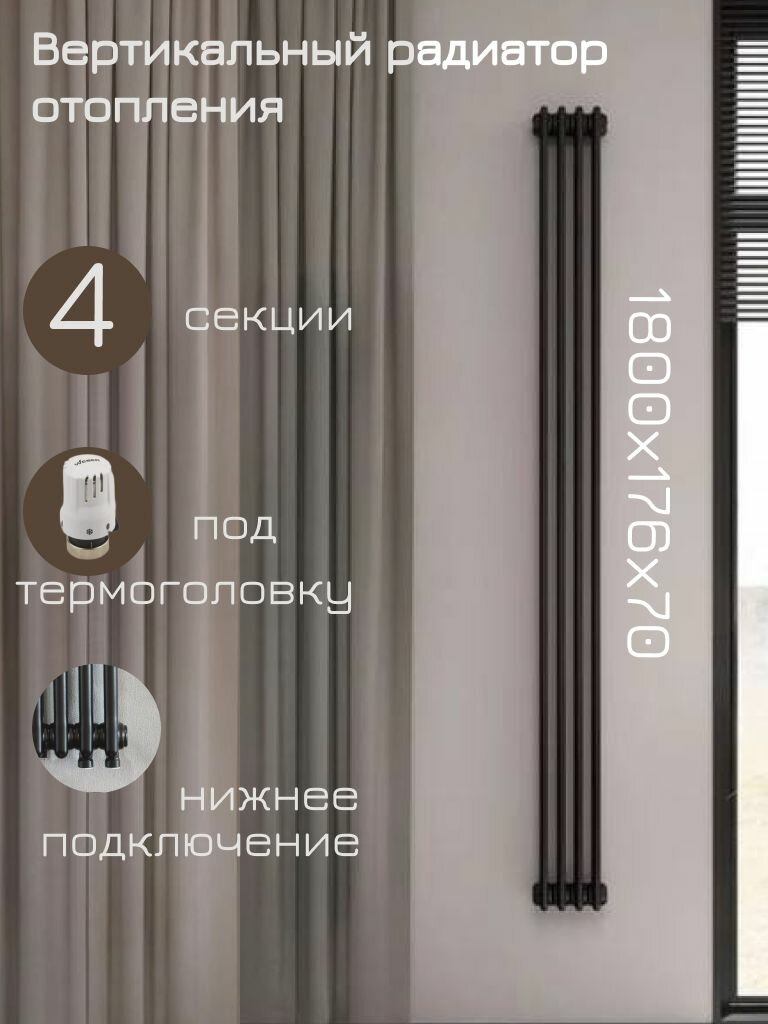 - Вертикальная конструкция — экономия до 40% места по сравнению с горизонтальными радиаторами