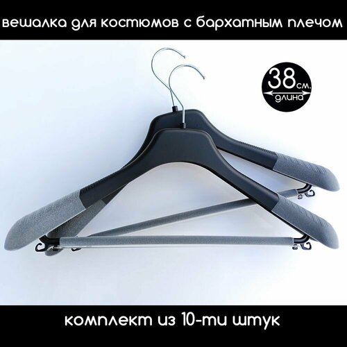 Вешалка-плечики костюмов и жакетов черная с широким плечом с бархатным покрытием и нескользящей перекладиной, c поворотным серебряным крючком PLECHIKOFF.