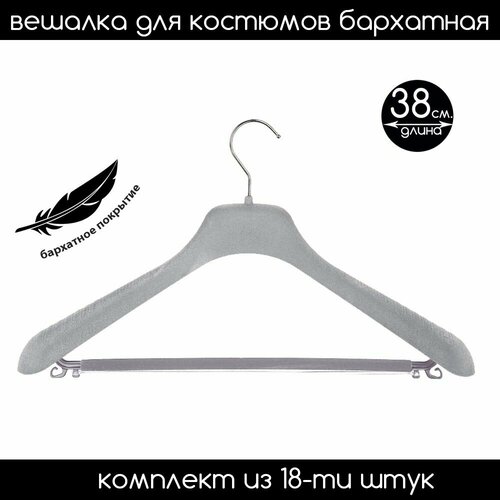 Вешалка-плечики для костюмов, верхней одежды и трикотажа серая бархатная с широким плечом и поворотным серебряным крючком и перекладиной PLECHIKOFF.
