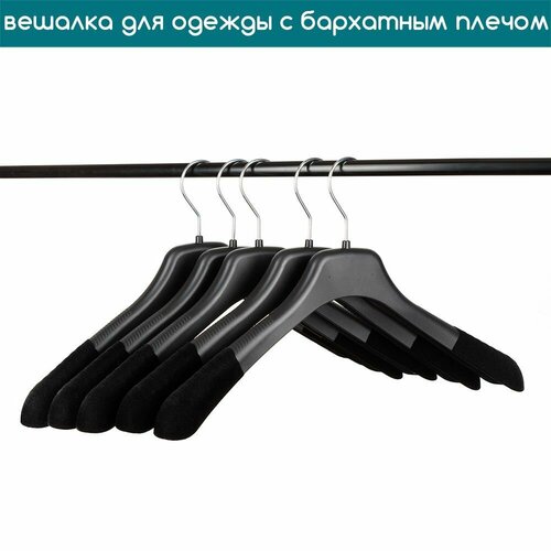 Вешалка-плечики для верхней одежды и трикотажа черная с широким плечом с бархатным покрытием, c поворотным серебряным крючком PLECHIKOFF.