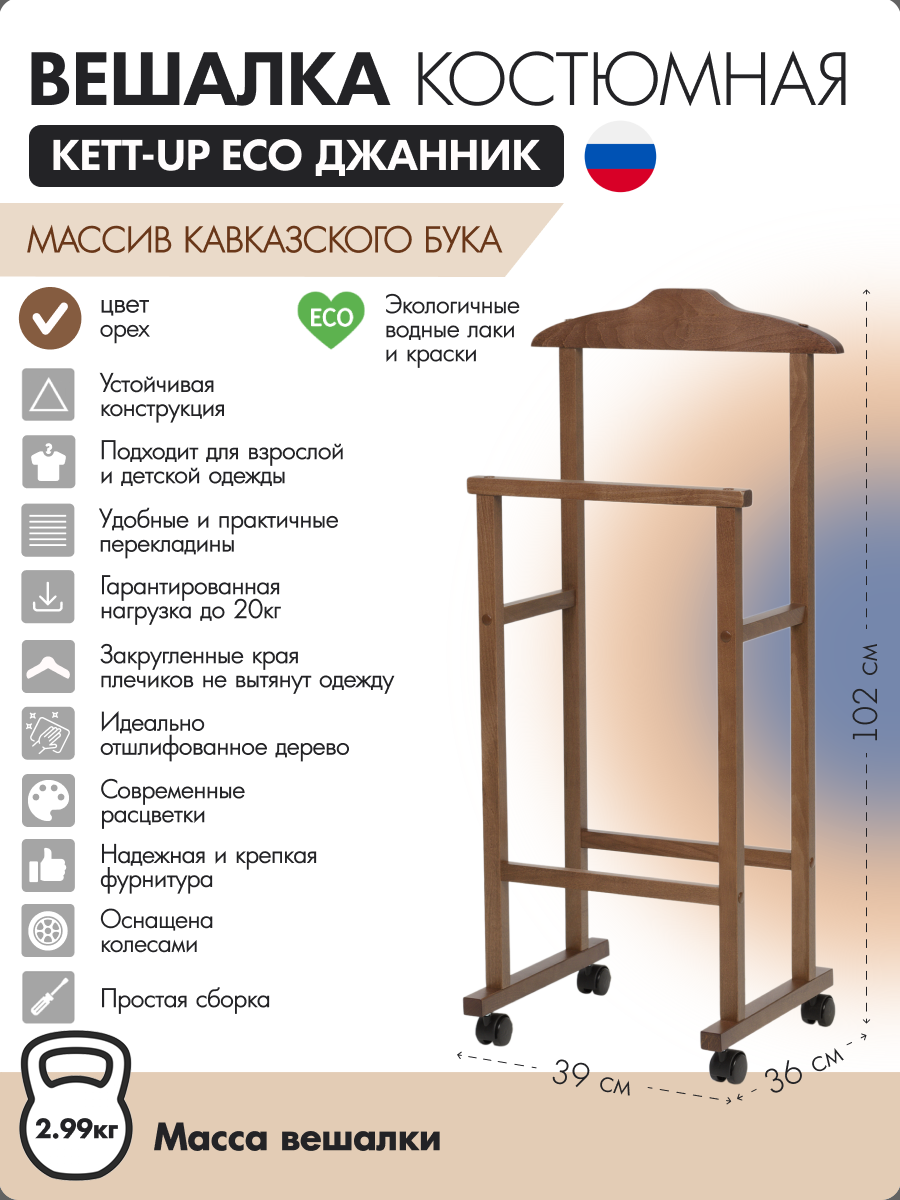 Вешалка на колесах KETT-UP ECO ДЖАННИК – это недорогая модель из популярной линейки костюмных вешалок. Костюмная вешалка напольная произведена из массива кавказского бука – самого надежного материала для производства мебели и мебельных аксессуаров. Почему именно бук? Массив кавказского бука отличается высокой прочностью, красивой благородной текстурой. Древесина бука рекомендуется для производства детской мебели и мебели, требующей высокой нагрузки – табуреты, столы, скамейки. Мебельщики-профессионалы хорошо знают насколько массив бука хорош для производства мебели и аксессуаров, а в особенности столов и стульев. Бук имеет высокую прочность, превосходящую по показателям дубовую мебель. Одно из преимуществ – это особенный природный рисунок годичных колец, отличающий особой теплой красотой эту древесину.