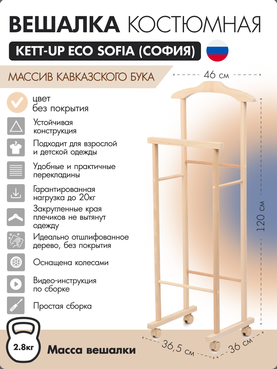 Вешалка костюмная деревянная KETT-UP ECO SOFIA (софия) – это великолепная классическая модель деревянной вешалки серии KETT-UP ECO. Костюмная вешалка деревянная произведена из массива кавказского бука – самого крепкого сорта древесины для производства мебели и мебельных аксессуаров. Почему именно бук? Массив кавказского бука отличается высокой прочностью, красивой благородной текстурой. Древесина бука рекомендуется для производства детской мебели и мебели, требующей высокой нагрузки – табуреты, стулья, столы, скамейки. Мебельщики-профессионалы хорошо знают насколько массив бука хорош для производства мебели и аксессуаров, а в особенности столов и стульев. Бук имеет высокую прочность, превосходящую по показателям дубовую мебель. Одно из преимуществ – это особенный природный рисунок годичных колец, отличающий особой теплой красотой эту древесину. Вешалка напольная деревянная KETT-UP ECO SOFIA (софия) поставляется без покрытия, в идеально отшлифованном виде. Вешало подготовлено к дальнейшей покраске, и придав индивидуальность Вы превратите его в потрясающий интерьерный арт-объект. Для этого достаточно покрыть его морилкой, краской или эмалью предварительно нанеся грунтовку. Это приобретение также понравиться любителям домашнего творчества. Родители вместе с детьми с удовольствием придумают своей неповторимый дизайн, где каждый сможет дать волю воображению и проявить удивительные способности художника.