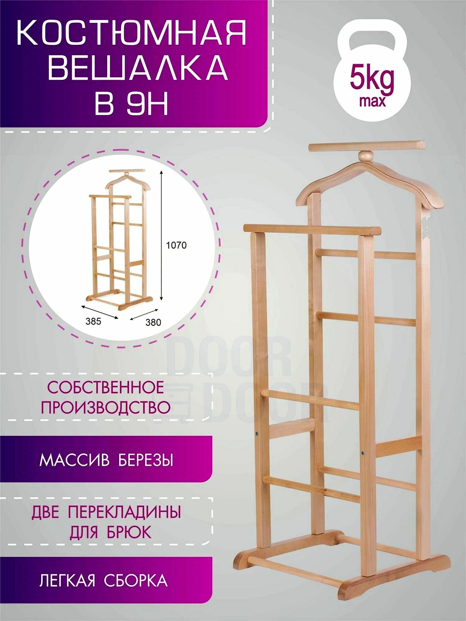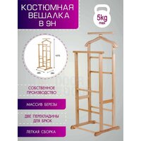Если у вас еще нет костюмной вешалки, то не сомневайтесь в полезности ее приобретения. Данная модель в отличие от модели В6Н дополнена второй стойкой, на которой расположена перекладина для брюк, это может быть иногда удобнее. Вешалка полностью изготовлена из массива дерева, имеет классический вид, надежна и экономична. Необычную форму плечиков позволила воспроизвести технология гнуто-клееного шпона. Все детали вешалки защищены лаковым покрытием. За вешалкой очень просто ухаживать. Вешалка компактно упакована, имеет небольшой вес, так что ее можно транспортировать даже в общественном транспорте, не говоря о личном или грузовом.