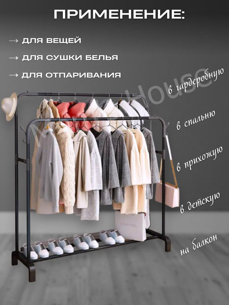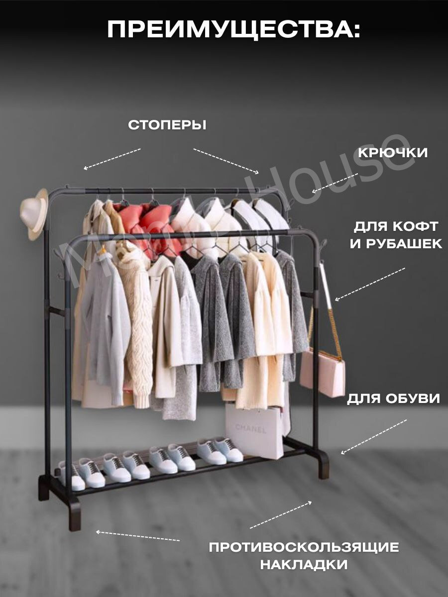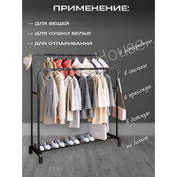 Напольная вешалка - один из самых практичных и удобных способов хранения вещей. На ней размещается большое количество вещей. Можно разместить в спальне или в детской комнате, в прихожей или в коридоре, гардеробной или на балконе. Благодаря прочному металлу отлично справится и с верхней одеждой. Универсальна и многофункциональна в применении. Используйте ее также для сушки вещей или отпаривания. Железная конструкция оснащена полкой для обуви. На данных перекладинах также можно хранить коробки, корзины или кофры и даже сумки и рюкзаки. Боковые крючки пригодятся для шарфов, сумок и аксессуаров. Идеально подходит для использования как в домашних условиях, так и в общественных местах, таких как офисы, магазины или гостиницы. Пригодится и для школьной формы. Каждый рейл имеет стопперы, чтобы плечики не спадали. Благодаря противоскользящим накладкам, ножки не царапают пол. Проста в сборке. Штанги выдерживают вес до 20 кг. Стильная. Прочная. Надежная. Отлично гармонирует с любым интерьером и мебелью.