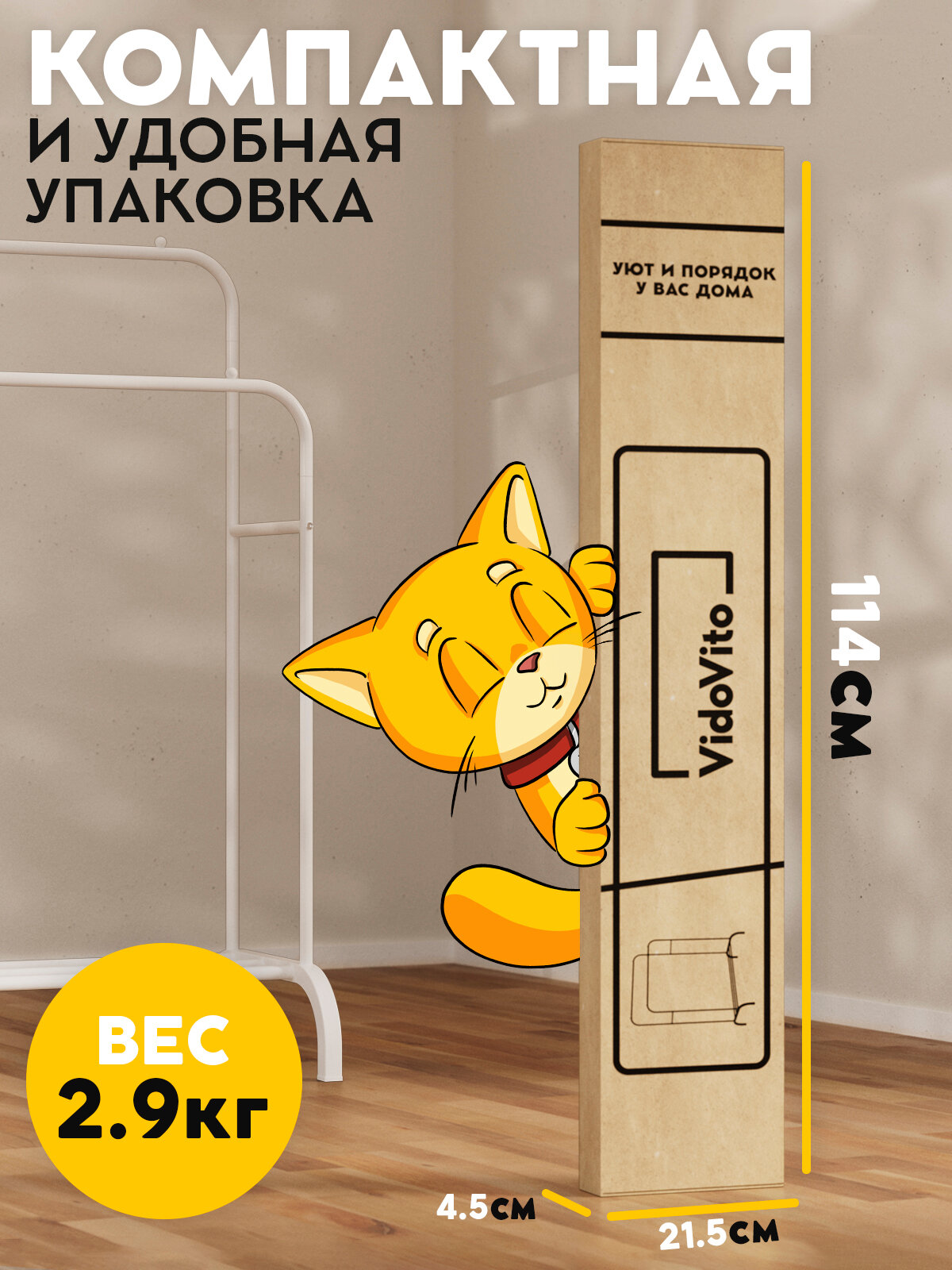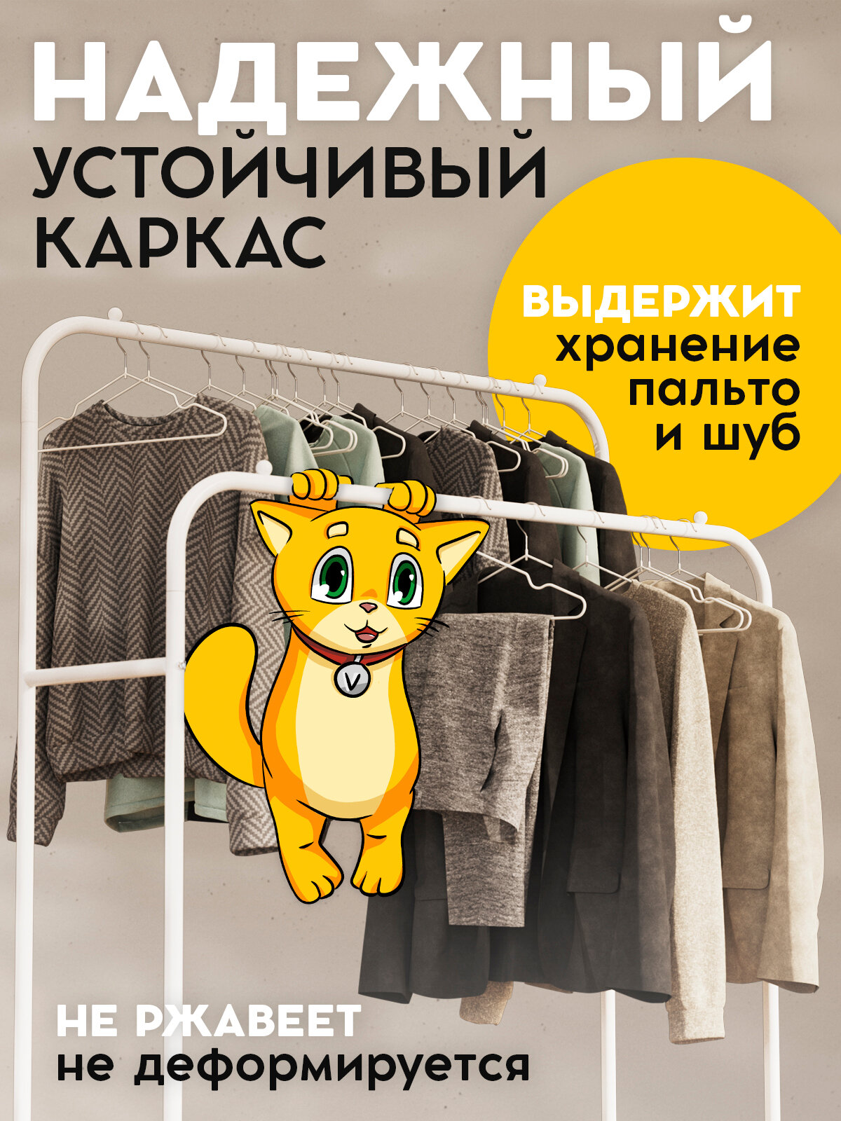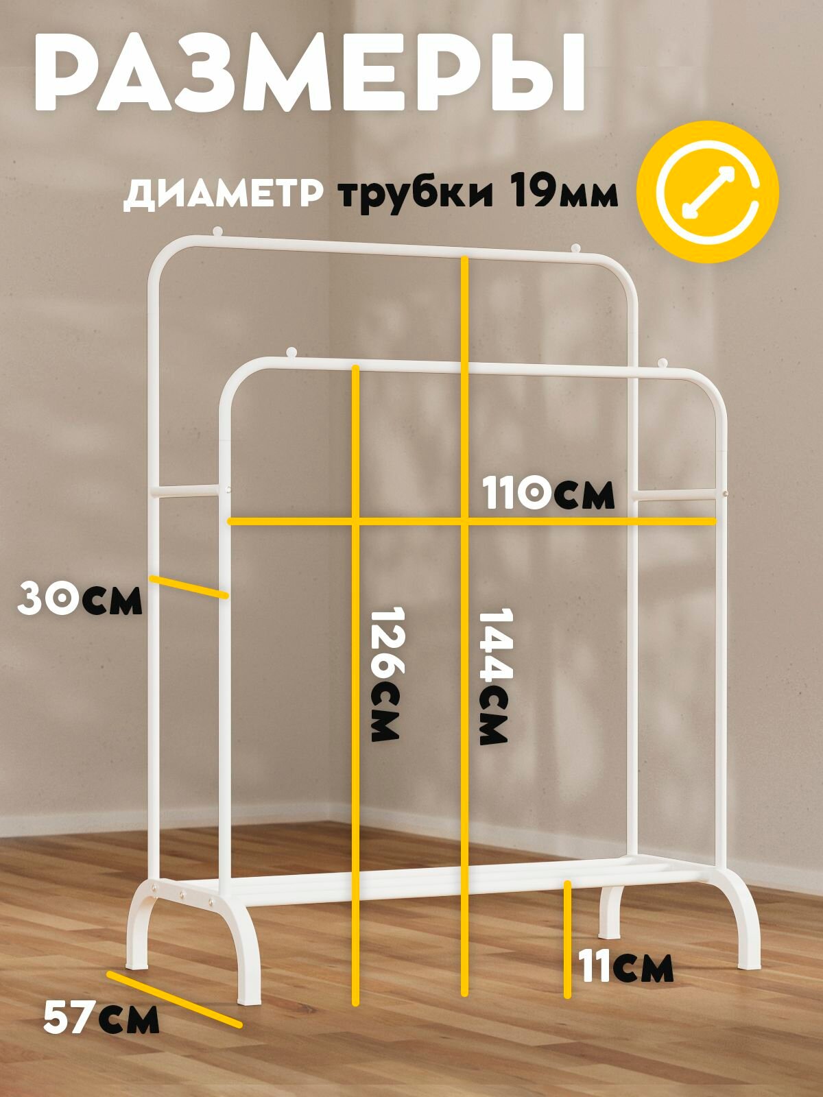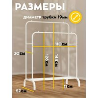 Вешалка выполнена из прочного металла, что гарантирует её долговечность и надежность. Её минималистичный белый дизайн отлично впишется в любой интерьер, придавая помещению современный вид. Размеры 144x110x57 см позволяют разместить её даже в ограниченном пространстве, а большой гардероб будет выглядеть аккуратно и организованно.