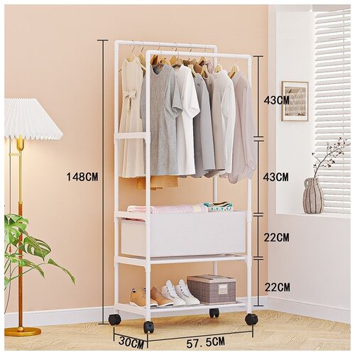 Универсальная напольная вешалка подойдёт в качестве замены крупногабаритной мебели, такой как шкаф, комод или тумбочка. Для удобства хранения одежды конструкция разделена на несколько сегментов (полка, ящик для хранения, две перекладины). Вешалка напольная для одежды и головных уборов имеет ряд преимуществ. Конструкция легко собирается и разбирается, благодаря небольшому весу вешалку и колесикам можно без труда передвигать по дому. Напольный стеллаж можно установить в спальне, коридоре или гардеробной комнате, он подойдёт для хранения легкой одежды. Стеллаж может пригодиться вам и для использования в ванной или на кухне. Именно поэтому этажерка является универсальным и незаменимым предметом в доме. Размер (Д х Ш х В)-57,5х30х147 см. Цвета – черный, белый. Материал: металл , пластик.
