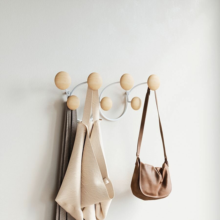 Вешалка для одежды Dotsy – стильное и практичное решение для современной прихожей. Прочное стальное основание обеспечивает изделию надежность и долговечность. Крючки из древесины сосны округлой формы с гладкой поверхностью исключают случайное повреждение одежды, выдерживают нагрузку до 2,3 кг каждый. Сочетание дерева и металла органично вписывается в различные варианты оформления интерьера. Конструкция крепится к стене на два шурупа.