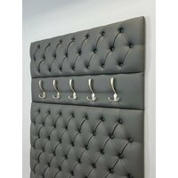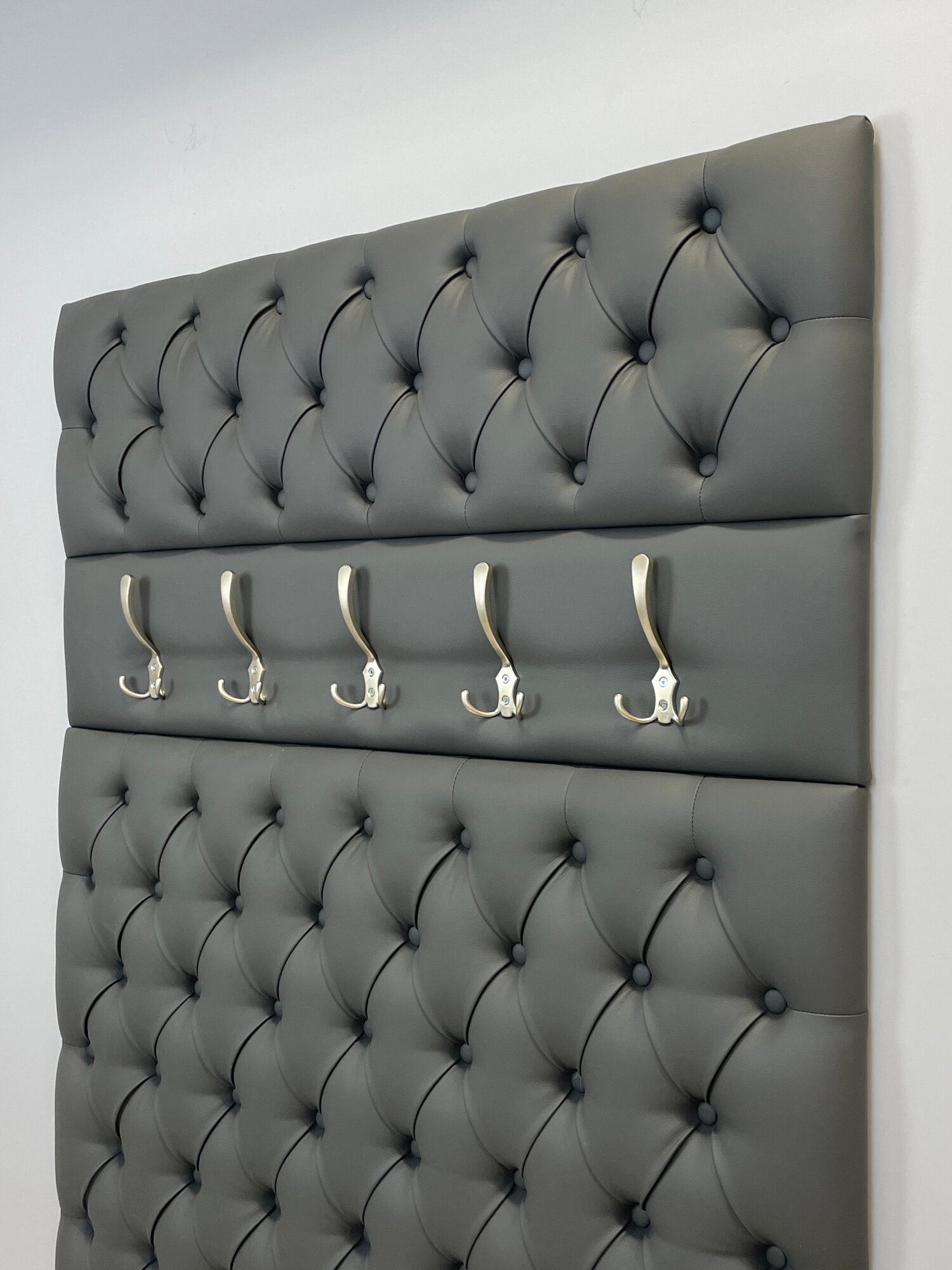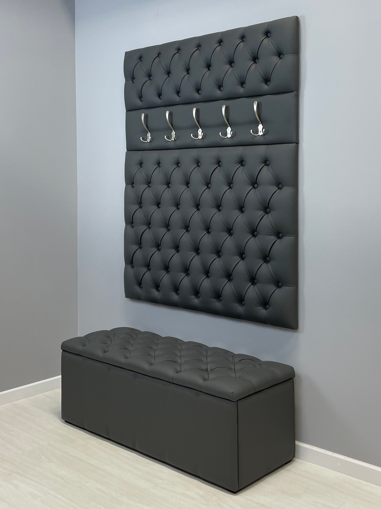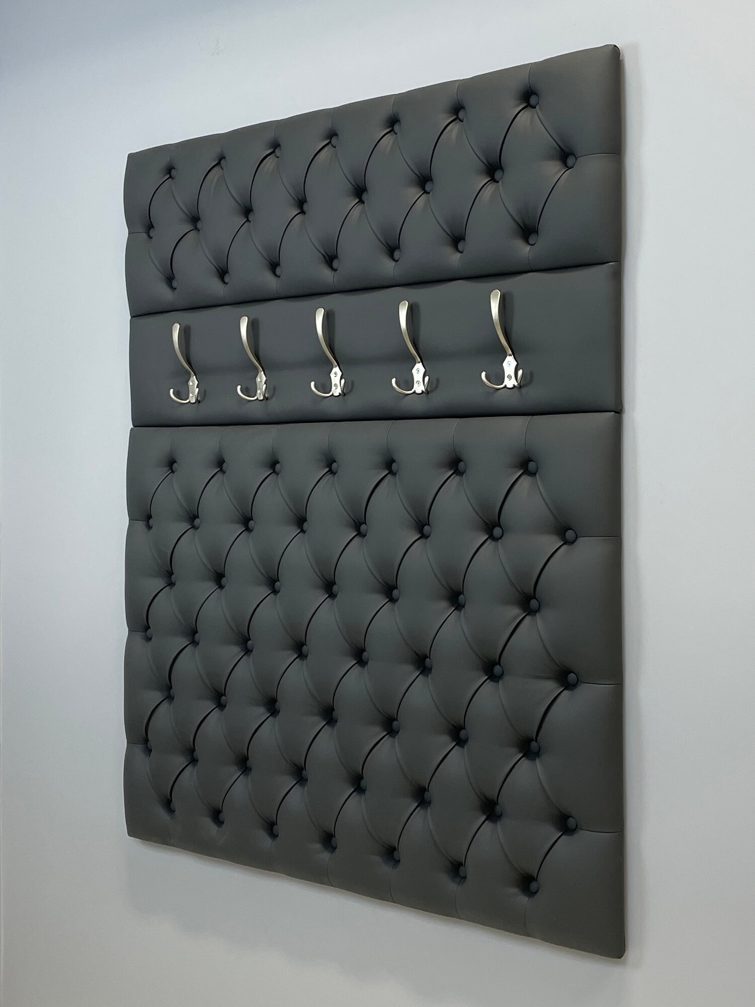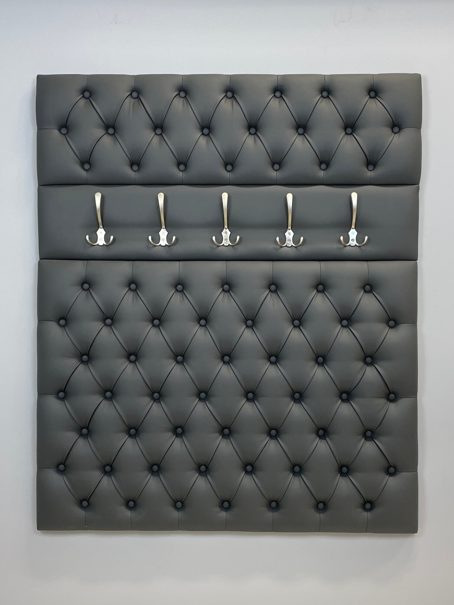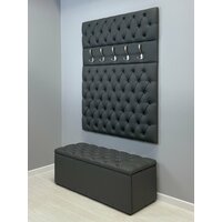 Вешалка настенная 105 для прихожей (Экокожа) выполнена с каретной стяжкой, стразами и 5-ю крючками. Поставляется в разобранном виде в картонной упаковке (состоит из 2х элементов, крючки не прикручены). Вешалка настенная для прихожей имеет размеры: высота 125 см, ширина 105 см. На стену вешалка для одежды крепится с помощью установленных сзади мебельных подвесов . Выполнена из тактильно приятной и мягкой Экокожи. Ручная работа каретной стяжки, оформленной пуговицами тон. Вешалка в прихожую настенная идеально подойдет к банкеткам из нашей коллекции (Банкетка в комплект не входит и приобретается отдельно). Банкетки с вешалками изготовлены из одного и того же материала. Цвет идентичен. Вешалка настенная идеально подойдет для прихожей, для апартаментов, для дачи.