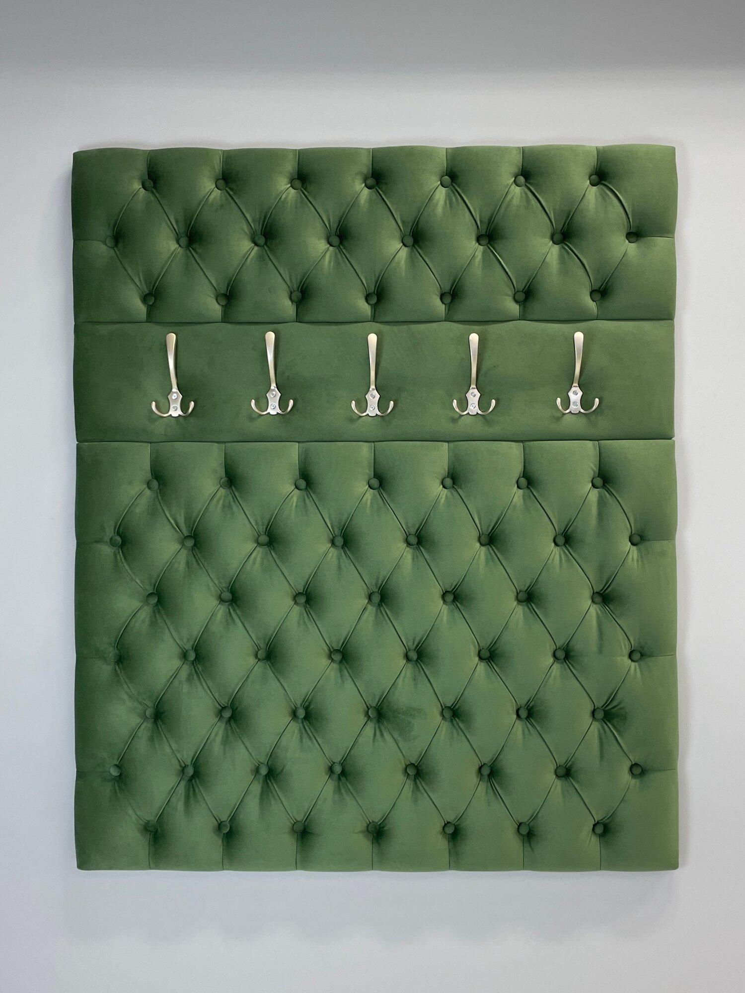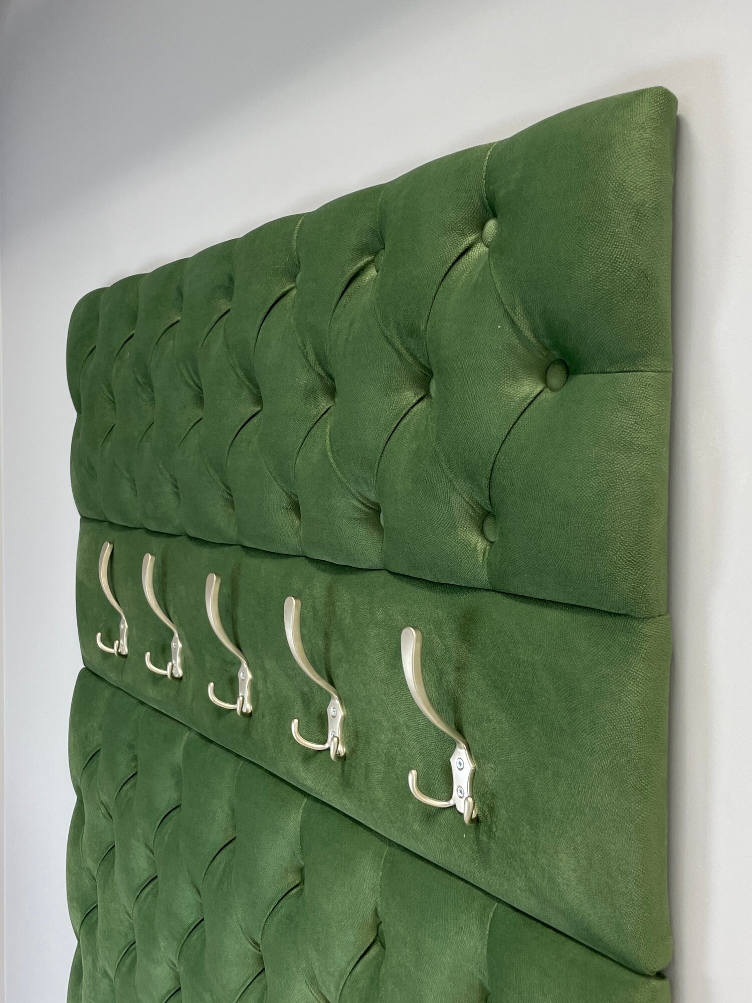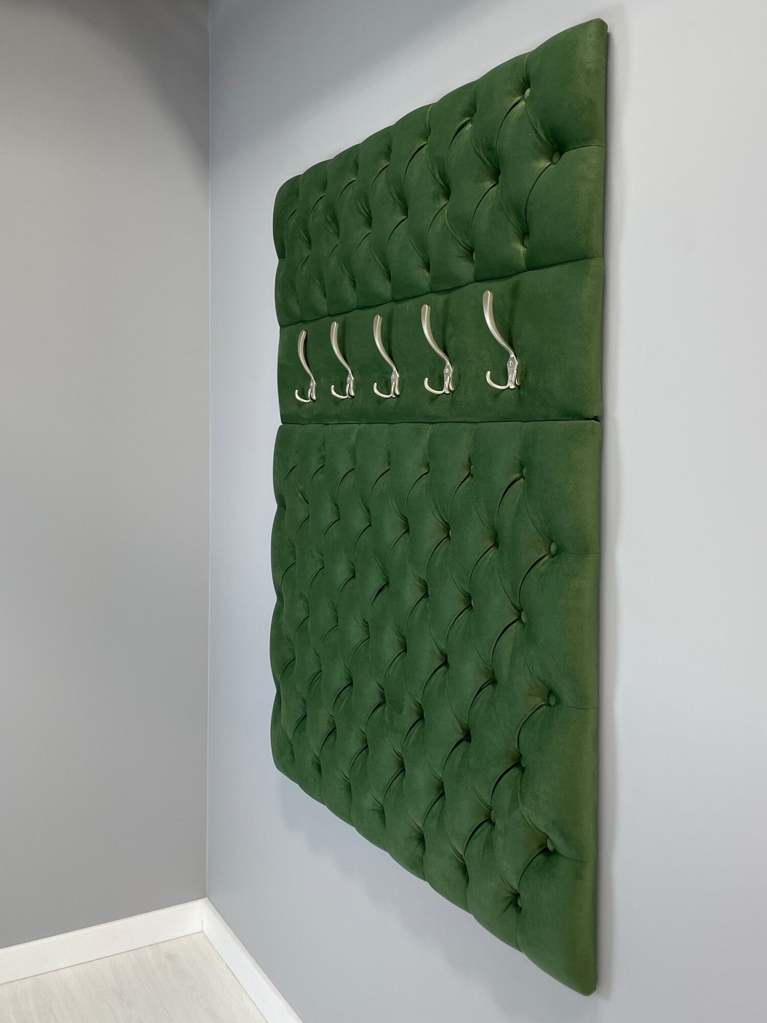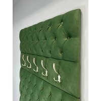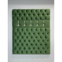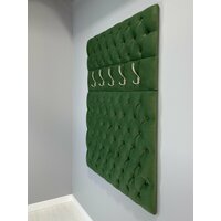 Вешалка настенная 105 для прихожей (Ткань Микровелюр) выполнена с каретной стяжкой, стразами и 5-ю крючками. Поставляется в разобранном виде в картонной упаковке (состоит из 2х элементов, крючки не прикручены). Вешалка настенная для прихожей имеет размеры: высота 125 см, ширина 105 см. На стену вешалка для одежды крепится с помощью установленных сзади мебельных подвесов . Выполнена из тактильно приятной и мягкой Ткани Микровелюр. Ручная работа каретной стяжки, оформленной пуговицами тон. Вешалка в прихожую настенная идеально подойдет к банкеткам из нашей коллекции (Банкетка в комплект не входит и приобретается отдельно). Банкетки с вешалками изготовлены из одного и того же материала. Цвет идентичен. Вешалка настенная идеально подойдет для прихожей, для апартаментов, для дачи.