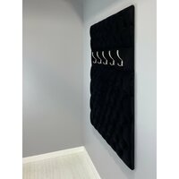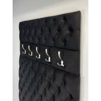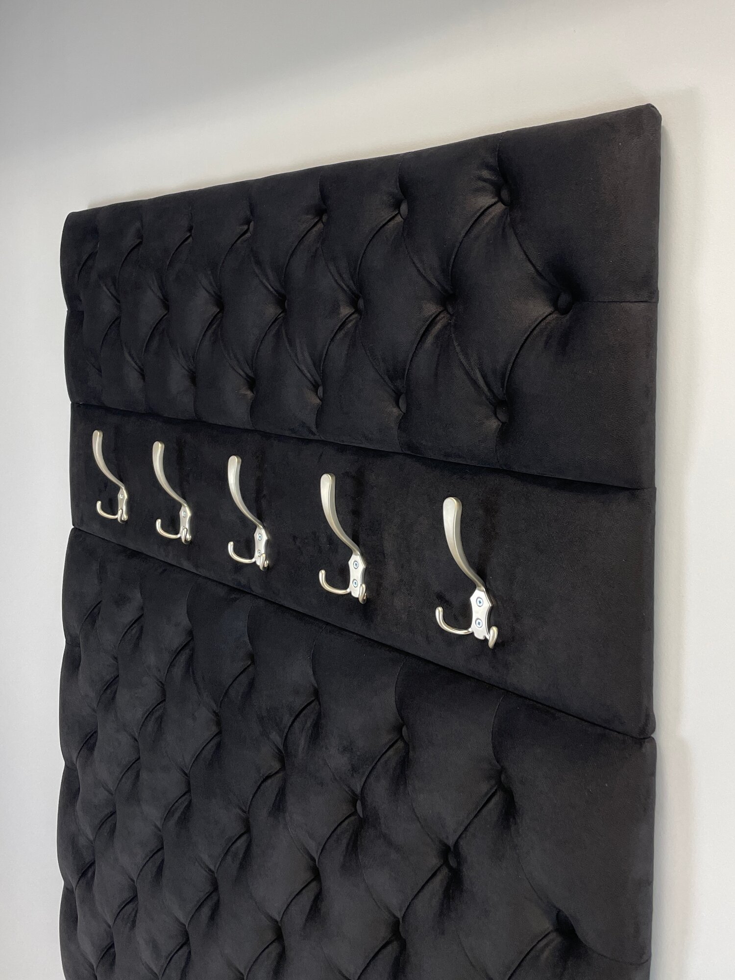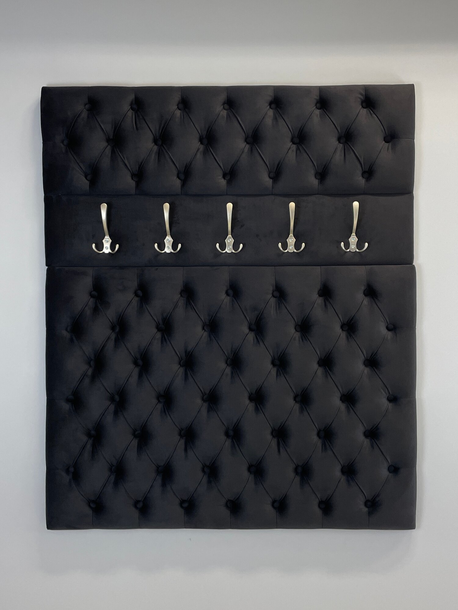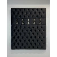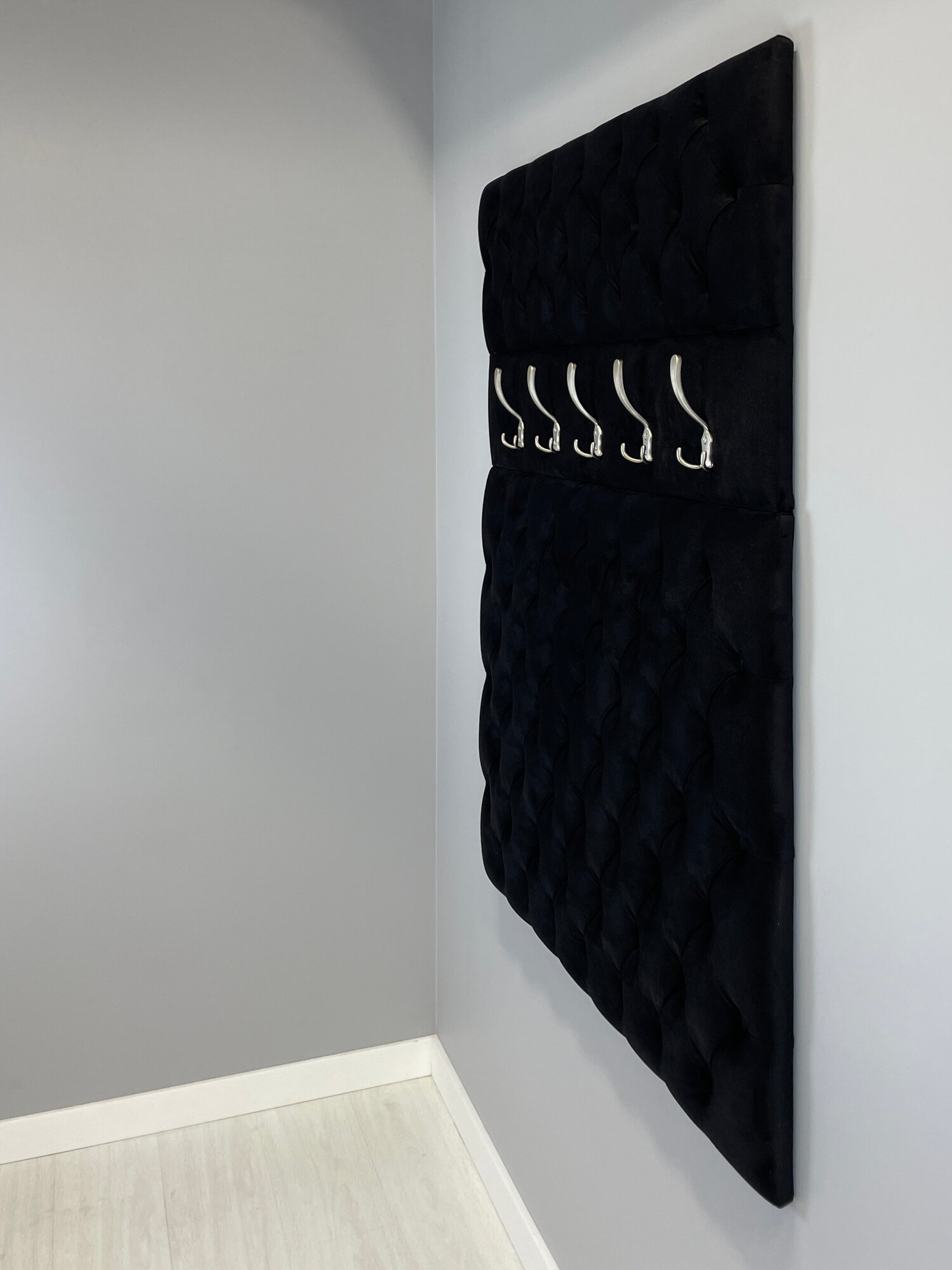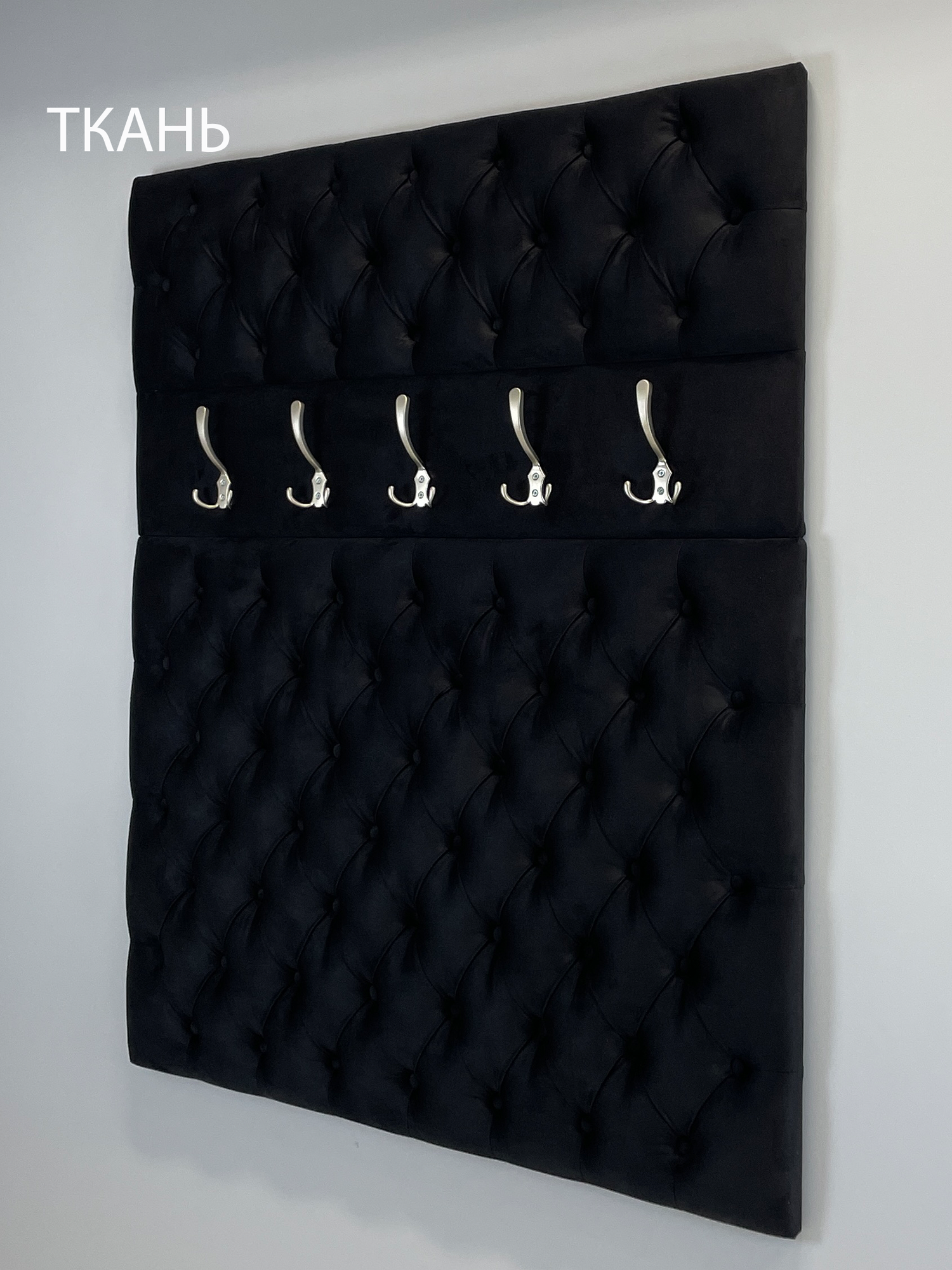 Вешалка настенная 105 для прихожей (Ткань Микровелюр) выполнена с каретной стяжкой, стразами и 5-ю крючками. Поставляется в разобранном виде в картонной упаковке (состоит из 2х элементов, крючки не прикручены). Вешалка настенная для прихожей имеет размеры: высота 125 см, ширина 105 см. На стену вешалка для одежды крепится с помощью установленных сзади мебельных подвесов . Выполнена из тактильно приятной и мягкой Ткани Микровелюр. Ручная работа каретной стяжки, оформленной пуговицами тон. Вешалка в прихожую настенная идеально подойдет к банкеткам из нашей коллекции (Банкетка в комплект не входит и приобретается отдельно). Банкетки с вешалками изготовлены из одного и того же материала. Цвет идентичен. Вешалка настенная идеально подойдет для прихожей, для апартаментов, для дачи.
