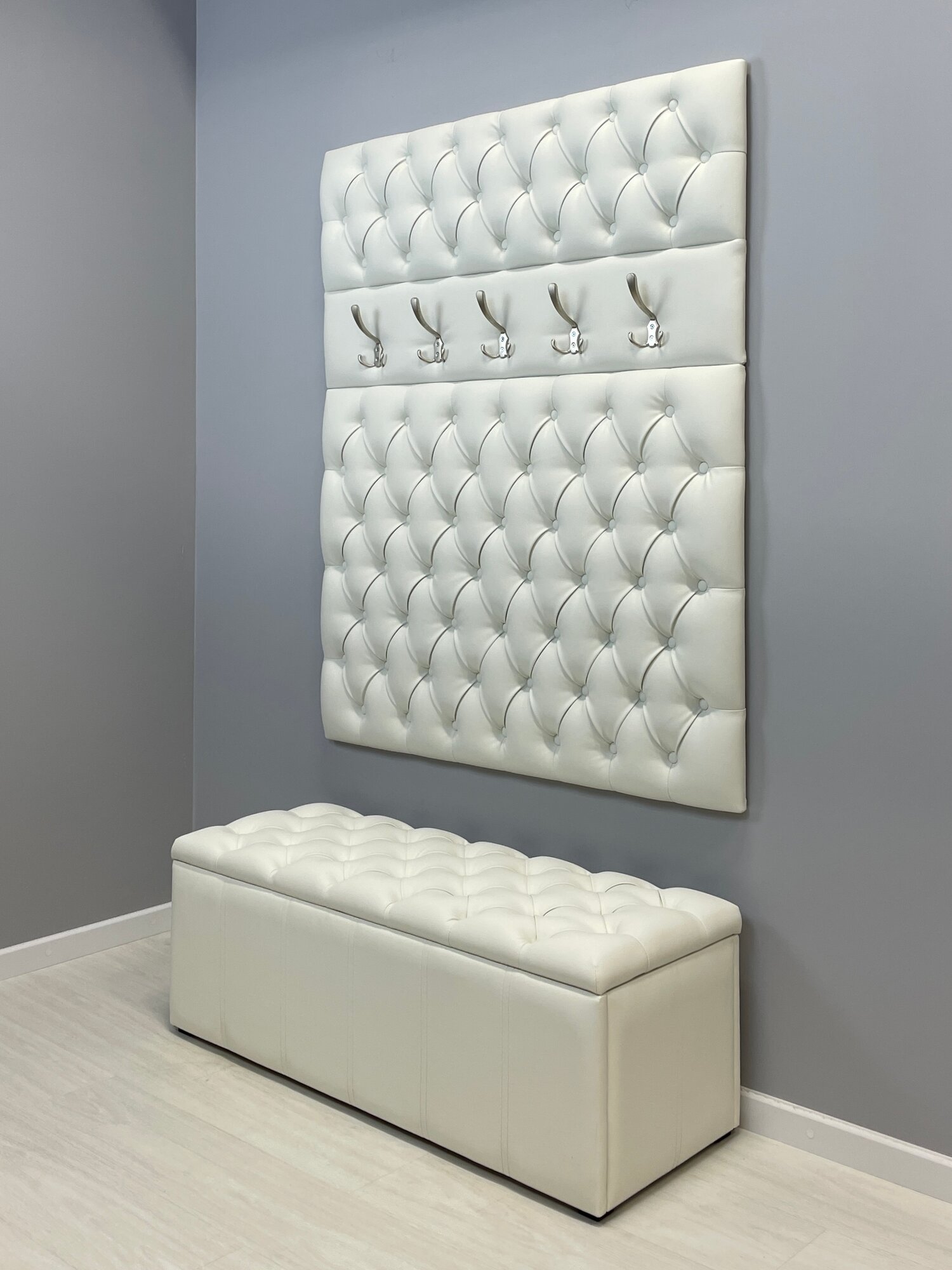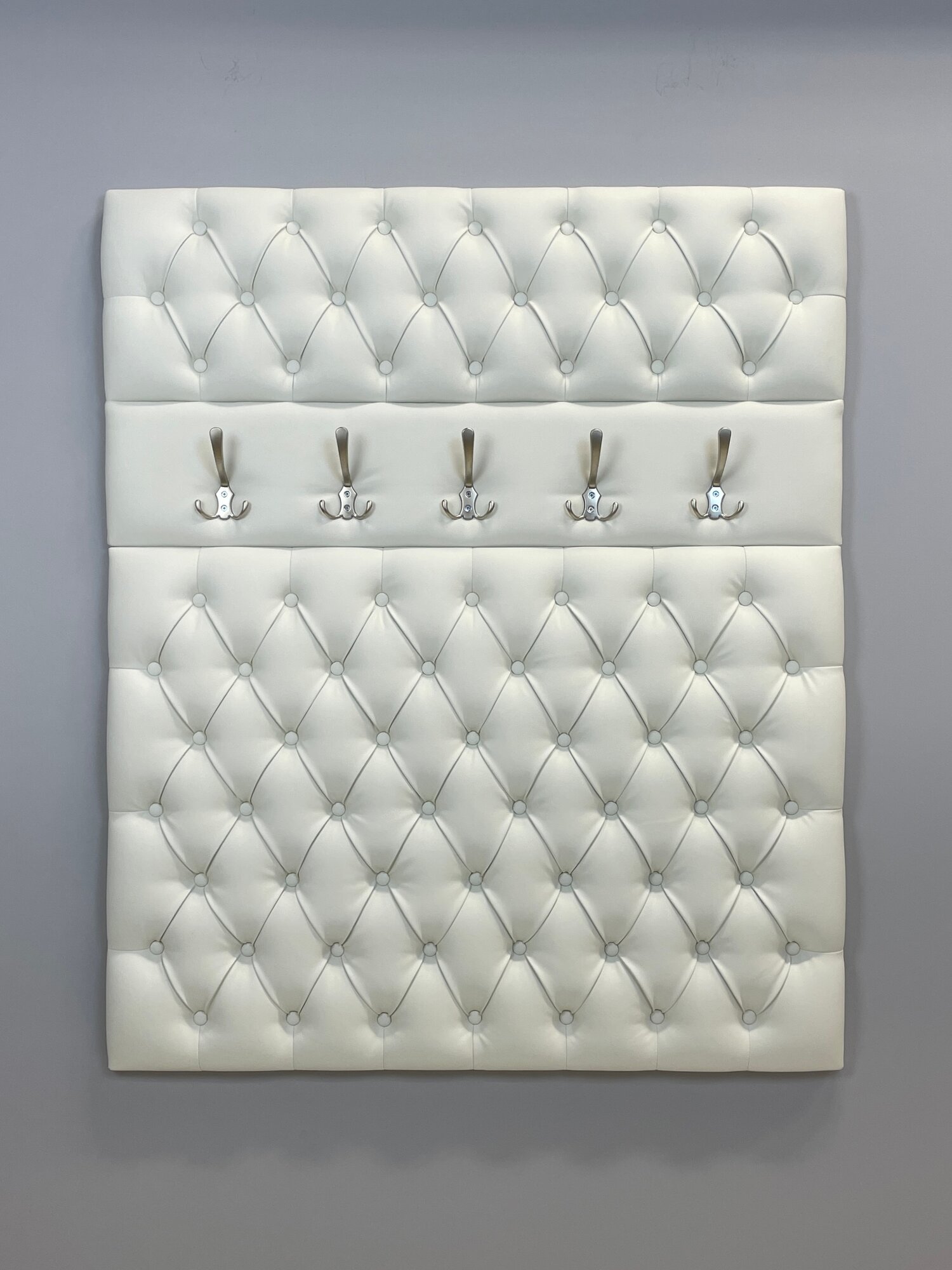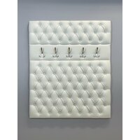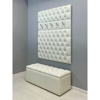 Вешалка настенная 105 для прихожей (Экокожа) выполнена с каретной стяжкой, стразами и 5-ю крючками. Поставляется в разобранном виде в картонной упаковке (состоит из 2х элементов, крючки не прикручены). Вешалка настенная для прихожей имеет размеры: высота 125 см, ширина 105 см. На стену вешалка для одежды крепится с помощью установленных сзади мебельных подвесов . Выполнена из тактильно приятной и мягкой Экокожи. Ручная работа каретной стяжки, оформленной пуговицами тон. Вешалка в прихожую настенная идеально подойдет к банкеткам из нашей коллекции (Банкетка в комплект не входит и приобретается отдельно). Банкетки с вешалками изготовлены из одного и того же материала. Цвет идентичен. Вешалка настенная идеально подойдет для прихожей, для апартаментов, для дачи.