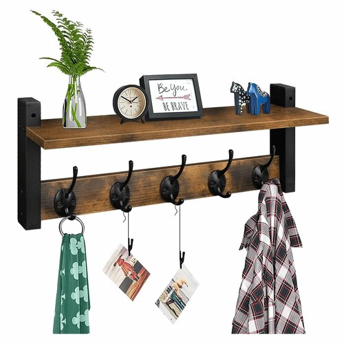 Настенная оригинальная вешалка в стиле лофт с полочкой. Прекрасно подойдет для прихожей, гостевой комнаты и даже для кухонных аксессуаров. Каркас изготовлена из металла и покрыт качественной порошковой краской, полка и основание для крючков из ЛДСП. Ширина полки 12 см. Расстояние между крючками 11см. Идеально впишется в любой интерьер и создаст уют в вашем доме. Легкая сборка каркаса на винтах.