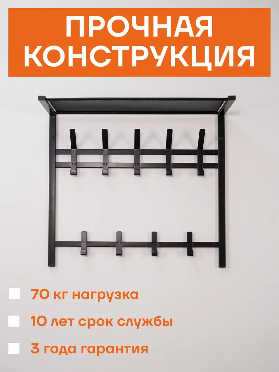 Настенная двухуровневая вешалка с полкой в стиле лофт "Торонто 22" от российского производителя "ЗМИ" создана для хранения верхней одежды в доме, офисе и на даче. Ее можно использовать практически в любом помещении: в коридоре, в ванной комнате, гардеробной, на кухне и даже в бане. Вешалка долго прослужит владельцу, благодаря материалу, из которого изготовлена - металл и полимерно-порошковое покрытие. Универсальная вешалка для хранения вещей имеет 9 крючков - каждый из них выдерживает до 5 кг постоянной нагрузки. На них можно разместить как куртки, так и плечики с пальто или шубой. На полке можно разместить головные уборы, шарфы, полотенца. В комплектацию изделия не входит комплект крепежа в связи с тем, что на разные стены требуется разный крепеж. Вешалка в прихожую продается в разобранном виде в коробке с ручкой, что позволяет с удобством донести ее до дома с пункта выдачи. Инструмент и фурнитура для сборки в комплекте. Мебель продаётся напрямую от производителя, что гарантирует качество и выгодную цену. Расширенная гарантия составляет 3 года