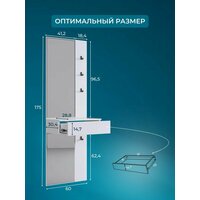 Цвет: Белое дерево Габариты: 60х175х30,4 см (ШхВхГ) Максимальная нагрузка на ящик: 15 кг Материал фасада и корпуса: ЛДСП 16 мм Рекомендуется крепить к стене. Сборка универсальная: зеркало можно расположить и справа, и слева. Тип направляющих в ящике: шариковые полного выдвижения.
