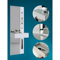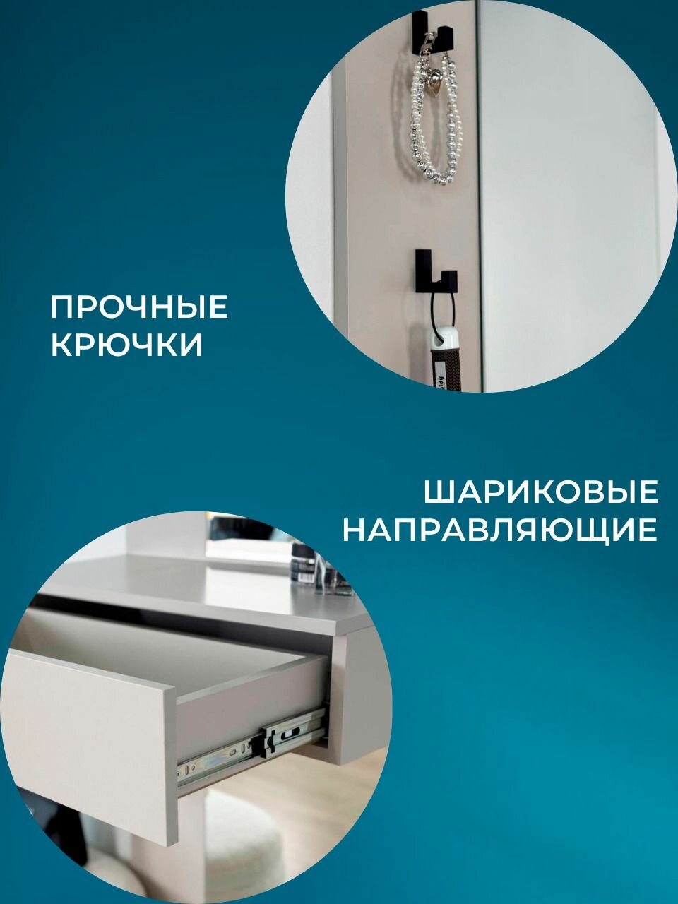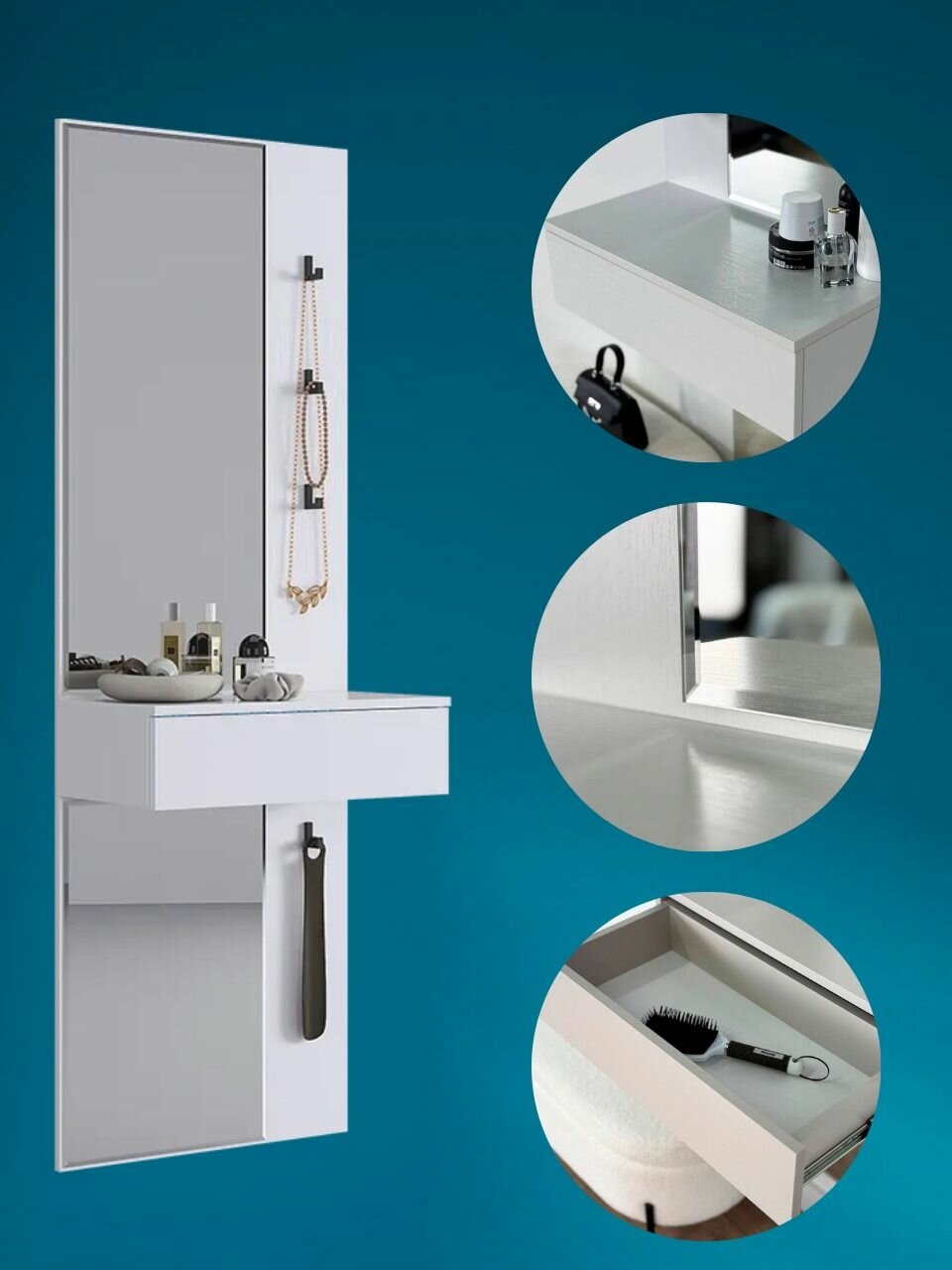 Настенная вешалка с зеркалом "Mercy" – стильное и функциональное решение для вашего интерьера. Это зеркало сочетает в себе элегантный дизайн и практичность, идеально подходя для прихожей, спальни или гостиной. Материал каркаса – ЛДСП, что обеспечивает прочность и долговечность, а также легкость в уходе. Крючки из высококачественного ABS пластика предоставляют удобное место для хранения сумок или аксессуаров. Выкатной ящик на шариковых направляющих служит дополнительным пространством для хранения мелочей, таких как ключи, кошелек, косметика или другие небольшие предметы. Трюмо "Mercy" – это идеальное сочетание функциональности и стиля, которое поможет вам поддерживать порядок и уют в доме. Оно станет незаменимым элементом вашего интерьера, обеспечивая удобство и эстетическую привлекательность.