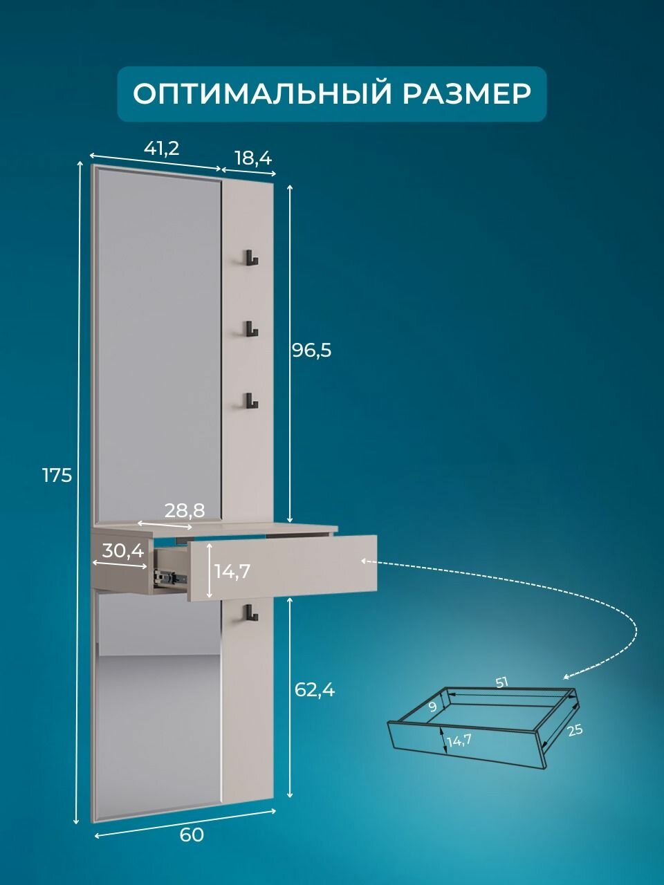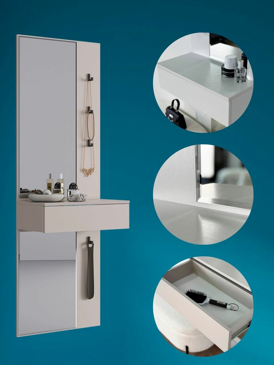 Настенная вешалка с зеркалом "Mercy" – стильное и функциональное решение для вашего интерьера. Это зеркало сочетает в себе элегантный дизайн и практичность, идеально подходя для прихожей, спальни или гостиной. Материал каркаса – ЛДСП, что обеспечивает прочность и долговечность, а также легкость в уходе. Крючки из высококачественного ABS пластика предоставляют удобное место для хранения сумок или аксессуаров. Выкатной ящик на шариковых направляющих служит дополнительным пространством для хранения мелочей, таких как ключи, кошелек, косметика или другие небольшие предметы. Трюмо "Mercy" – это идеальное сочетание функциональности и стиля, которое поможет вам поддерживать порядок и уют в доме. Оно станет незаменимым элементом вашего интерьера, обеспечивая удобство и эстетическую привлекательность.