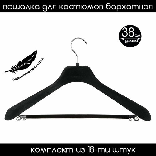 Вешалка-плечики для костюмов, верхней одежды и трикотажа черная бархатная с широким плечом и поворотным серебряным крючком и перекладиной PLECHIKOFF.