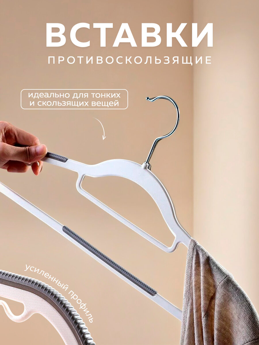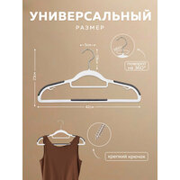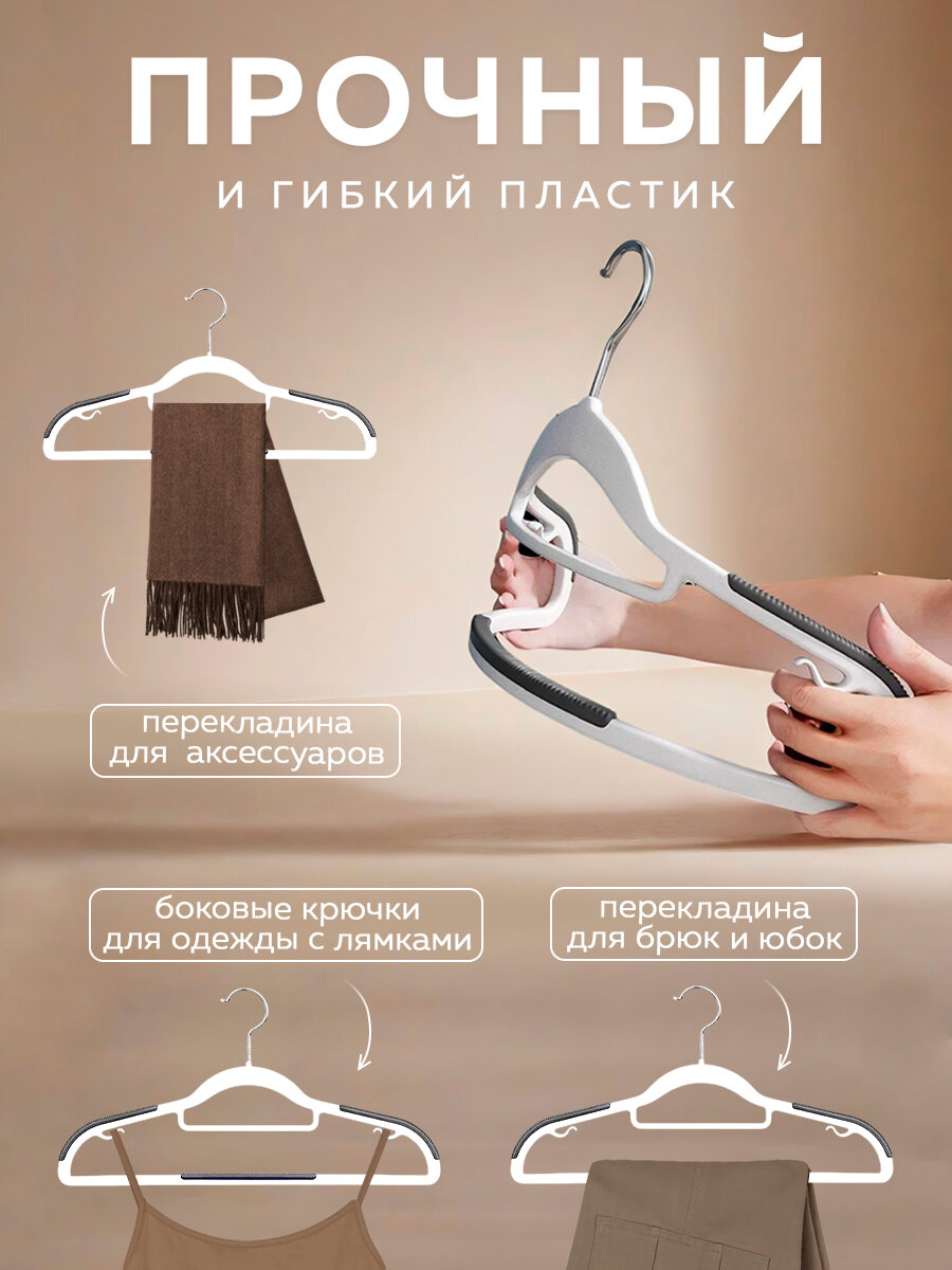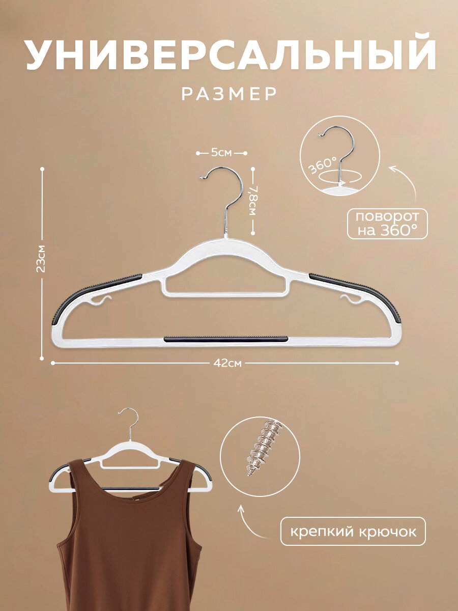 Крючки, вращающиеся на 360 градусов, и нескользящее покрытие добавляют удобства в использовании, предотвращая случайное соскальзывание одежды. Петельки для бретелек позволяют безопасно хранить платья и топы на тонких бретелях, обеспечивая их надёжную фиксацию. Эти вешалки станут незаменимыми помощниками в организации гардероба, помогая поддерживать порядок и сохраняя вашу одежду в идеальном состоянии.
