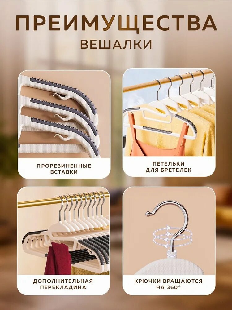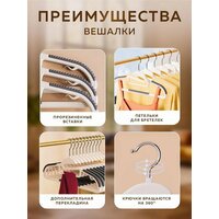 Металлический крючок с возможностью вращения на 360 градусов обеспечивает удобство при размещении и доставании одежды, а углубления по кромке предотвращают соскальзывание вещей. Эти вешалки эффективно экономят место в шкафу, позволяя оптимально использовать каждый сантиметр пространства. Простые и удобные в использовании, они станут незаменимыми помощниками в организации вашего гардероба, добавляя блеск и стиль в повседневную жизнь.