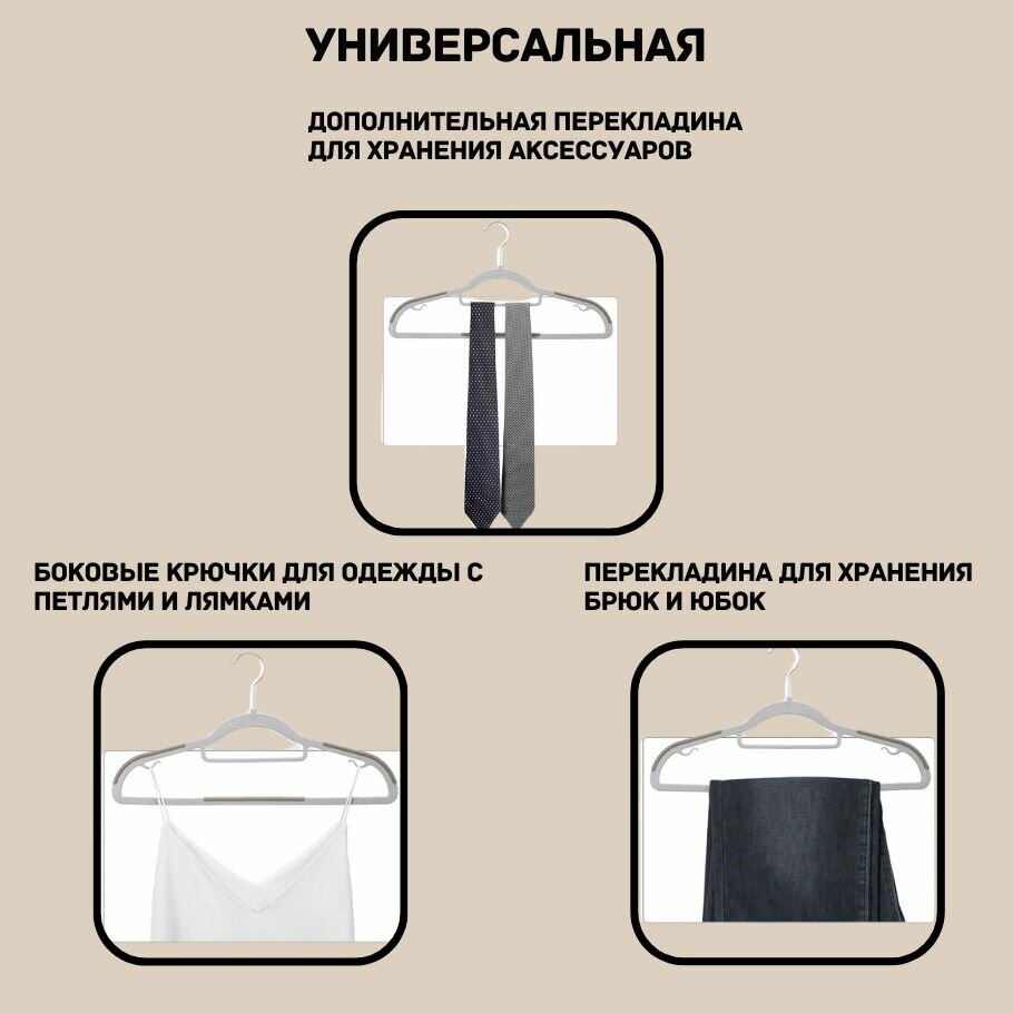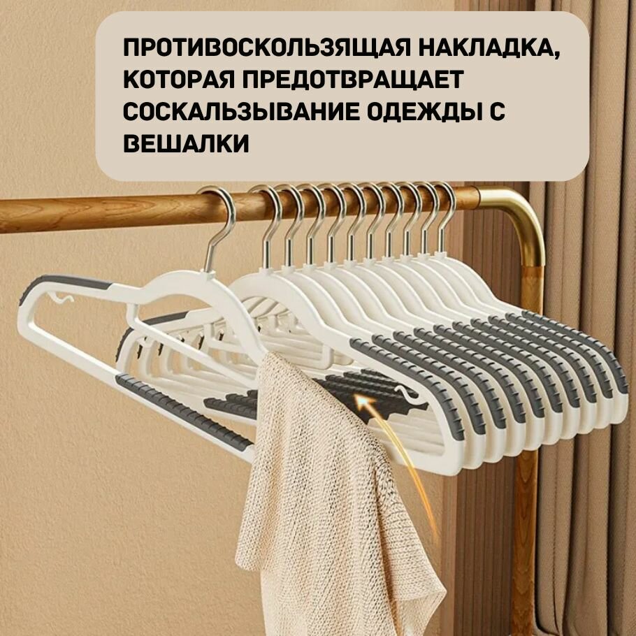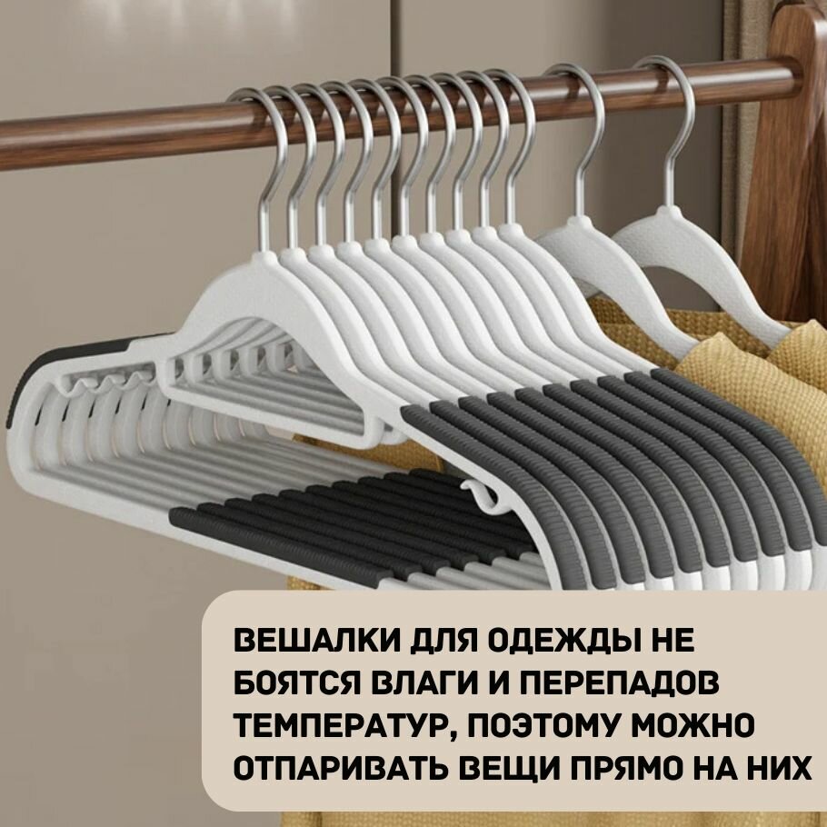 **Набор из 10 прочных пластиковых вешалок для одежды** с **специальным резиновым покрытием** обеспечивает надежную фиксацию – ваша одежда **не скользит по вешалке**!