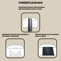 **Классическая форма тремпеля** с **перекладиной для брюк** и **выемкой для вещей с бретельками** делает эти плечики **универсальными** – подходят для **футболок, костюмов, курток, платьев и пиджаков**.