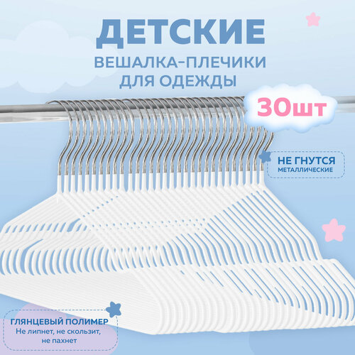 Ширина плечиков составляет 30 см, что подходит для детской одежды размера 32-34. Цвет вешалок – белый, что позволяет гармонично вписаться в любой интерьер.