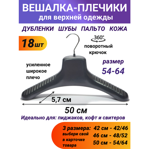 Вешалка - плечики для верхней одежды пластмассовая с металлическим вращающимся крючком. В каталоге представлены 3 размера вешалок: 42 см; 46 см; 50 см. Вешалка плечики 42 см подойдет на размер 42-46. Вешалки плечики 46 см подойдет на размер 48-52. Вешалки-плечики 50 см подойдут на размер 54-64. Также вы можете увидеть в нашем каталоге набор вешалок плечиков для одежды по 2 шт, 3шт, 6шт, 8 шт, 9 шт, 12 шт, 18 шт, 24 шт. Шубная вешалка для изделий из меха и кожи отличается высокой прочностью и толщиной стенок и предназначена для шубы, дубленки, меховых пальто, куртки. На внутренней стороне плечиков есть ребра жесткости. Эти ребра не дают плечикам прогибаться под большим весом верхней одежды. Вешалка для одежды спроектирована так, что она не вытягивает плечи, не цепляет одежду, и даже при длительном хранении верхняя одежда сохранит форму и не деформируется. Ширина плечика одинаковая по всей длине и составляет 5,7 см. При хранении на более узких плечиках (ширина менее 5 см) на мехе возникнут заломы, а также вытянутся швы и плечевой участок. Данная вешалка плечики отличается от простых вешалок из пластика величиной горловины, иначе воротник шубы или дубленки не будет ложиться должным образом. Плечики можно использовать и для другой одежды, склонный к растяжению: кофта, свитер. Плечики для одежды взрослые можно использовать для пиджака и жакета. Рекомендуем выбирать вешалку из пластика, т к деревянная вешалка может оставлять зацепки на одежде. Вешалка плечики для шубы широкая будет хорошим подарком маме, папе, сестре, бабушке, дедушке на день рождения, 8 марта, новый год. Также широкая пластмассовая вешалка идеально подойдет для покупки в бизнес целях: вешалка для офиса, вешалка для кафе, ресторана, фитнес-центра, гостиницы. Вешалки плечики пластмассовые крепкие станут отличным дополнением в вашем гардеробе.