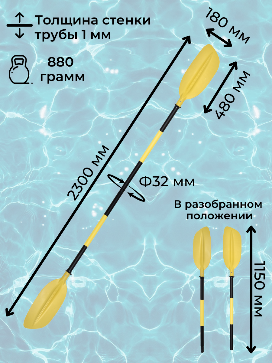 Весло изготовлено из прочного анодированного алюминия, что делает его устойчивым к коррозии и царапинам, а также обладает натуральным металлическим блеском. Диаметр трубы составляет 32 мм, толщина стенки 1 мм. Эргономичная рукоять с термоусадочной трубкой гарантирует равномерное распределение нагрузки на руку и предотвращает появление мозолей и усталости. Высококачественные материалы и продуманный дизайн обеспечивают комфорт и удобство при использовании. Конструкция улучшает сцепление руки с веслом и снижает риск случайного соскальзывания. Термоусадочная трубка защищает места хвата от износа и повреждений, увеличивая срок службы и устойчивость весла к внешним воздействиям. Соединение частей весла обеспечивается надёжными алюминиевыми фиксаторами, что облегчает процесс сборки и разборки изделия. Лопасти весла изготовлены из прочного пластика и имеют размер 48x18 см. Это позволяет эффективно управлять судном и выполнять различные манёвры на воде. На лопастях установлены брызгозащитные манжеты для защиты от попадания воды, что снижает затраты на обслуживание и ремонт весла. Угол поворота лопастей регулируется в трёх положениях: 0, 90 и 180 градусов. Весло сохраняет плавучесть как в собранном, так и в разобранном состоянии. Ещё одним преимуществом данного весла является его небольшой вес — 880 граммов.