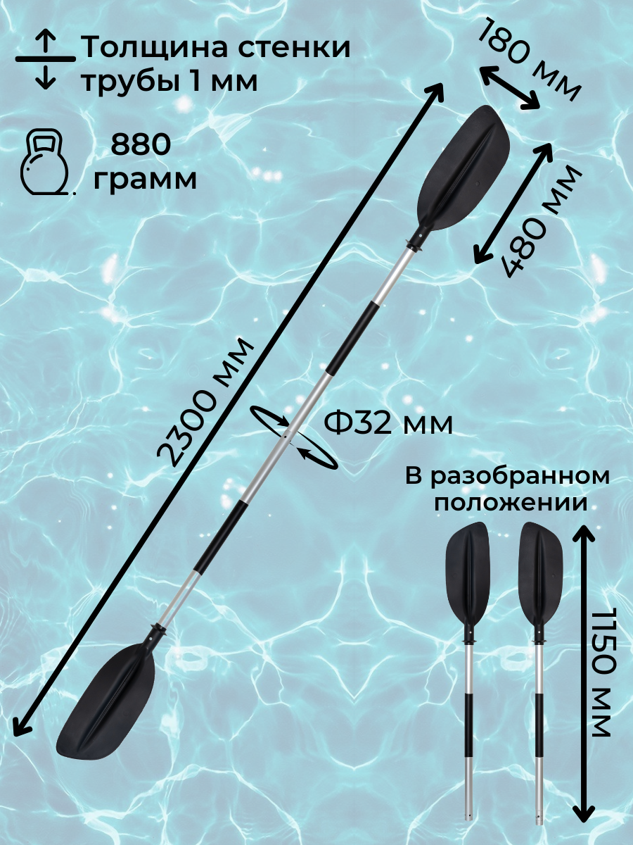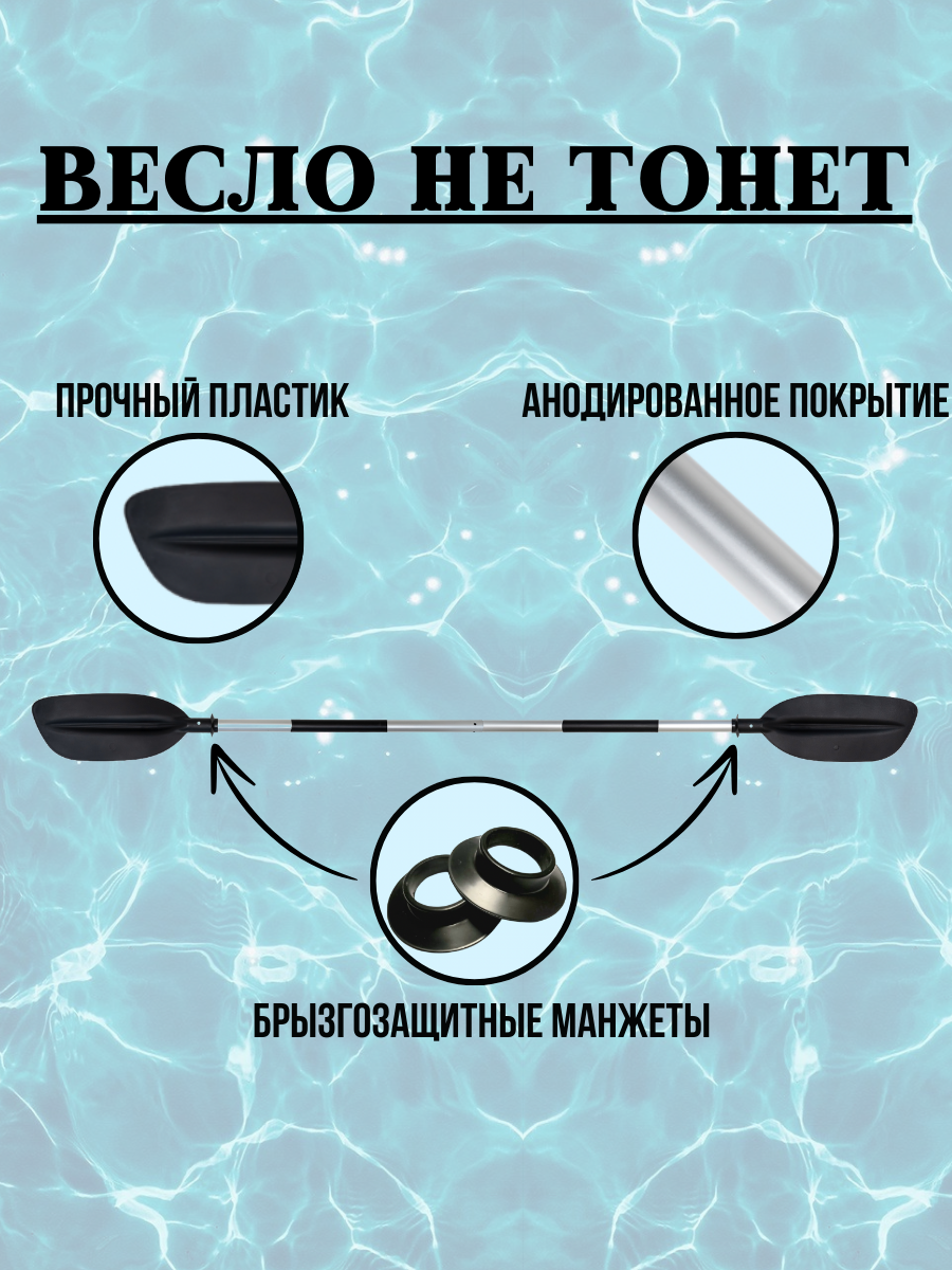 Весло изготовлено из прочного анодированного алюминия, что делает его устойчивым к коррозии и царапинам, а также обладает натуральным металлическим блеском. Диаметр трубы составляет 32 мм, толщина стенки 1 мм. Эргономичная рукоять с термоусадочной трубкой гарантирует равномерное распределение нагрузки на руку и предотвращает появление мозолей и усталости. Высококачественные материалы и продуманный дизайн обеспечивают комфорт и удобство при использовании. Конструкция улучшает сцепление руки с веслом и снижает риск случайного соскальзывания. Термоусадочная трубка защищает места хвата от износа и повреждений, увеличивая срок службы и устойчивость весла к внешним воздействиям. Соединение частей весла обеспечивается надёжными алюминиевыми фиксаторами, что облегчает процесс сборки и разборки изделия. Лопасти весла изготовлены из прочного пластика и имеют размер 48x18 см. Это позволяет эффективно управлять судном и выполнять различные манёвры на воде. На лопастях установлены брызгозащитные манжеты для защиты от попадания воды, что снижает затраты на обслуживание и ремонт весла. Угол поворота лопастей регулируется в трёх положениях: 0, 90 и 180 градусов. Весло сохраняет плавучесть как в собранном, так и в разобранном состоянии. Ещё одним преимуществом данного весла является его небольшой вес — 880 граммов.