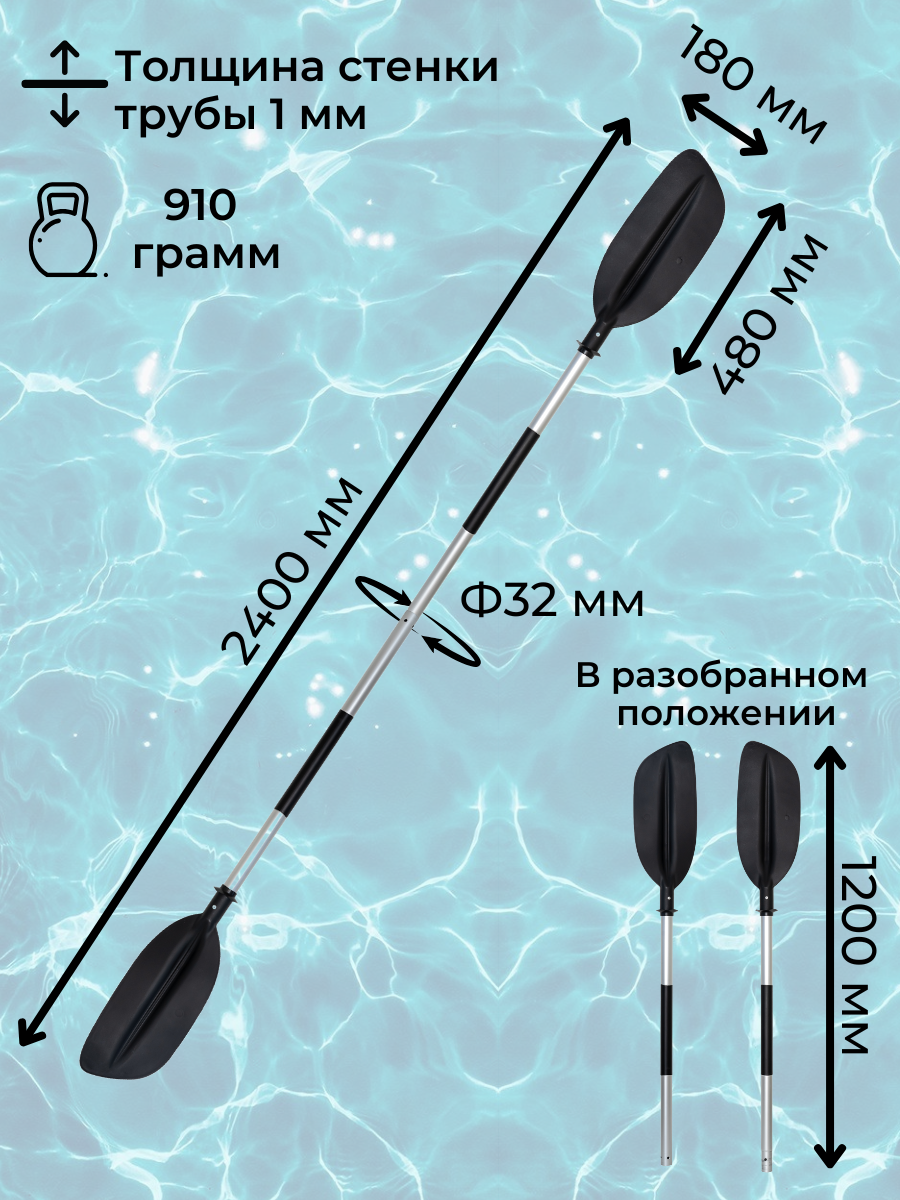 Весло изготовлено из прочного анодированного алюминия, что делает его устойчивым к коррозии и царапинам, а также обладает натуральным металлическим блеском. Диаметр трубы составляет 32 мм, толщина стенки 1 мм. Эргономичная рукоять с термоусадочной трубкой гарантирует равномерное распределение нагрузки на руку и предотвращает появление мозолей и усталости. Высококачественные материалы и продуманный дизайн обеспечивают комфорт и удобство при использовании. Конструкция улучшает сцепление руки с веслом и снижает риск случайного соскальзывания. Термоусадочная трубка защищает места хвата от износа и повреждений, увеличивая срок службы и устойчивость весла к внешним воздействиям. Соединение частей весла обеспечивается надёжными алюминиевыми фиксаторами, что облегчает процесс сборки и разборки изделия. Лопасти весла изготовлены из прочного пластика и имеют размер 48x18 см. Это позволяет эффективно управлять судном и выполнять различные манёвры на воде. На лопастях установлены брызгозащитные манжеты для защиты от попадания воды, что снижает затраты на обслуживание и ремонт весла. Угол поворота лопастей регулируется в трёх положениях: 0, 90 и 180 градусов. Весло сохраняет плавучесть как в собранном, так и в разобранном состоянии. Ещё одним преимуществом данного весла является его небольшой вес — 910 граммов.