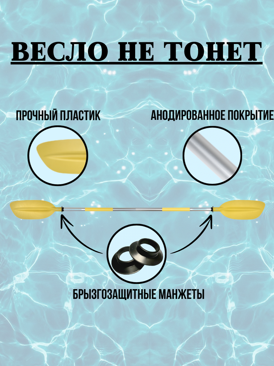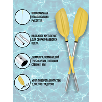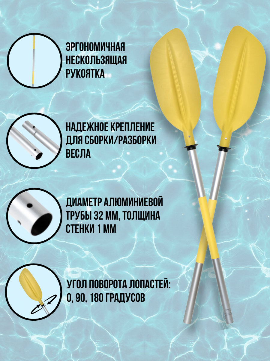 Весло изготовлено из прочного анодированного алюминия, что делает его устойчивым к коррозии и царапинам, а также обладает натуральным металлическим блеском. Диаметр трубы составляет 32 мм, толщина стенки 1 мм. Эргономичная рукоять с термоусадочной трубкой гарантирует равномерное распределение нагрузки на руку и предотвращает появление мозолей и усталости. Высококачественные материалы и продуманный дизайн обеспечивают комфорт и удобство при использовании. Конструкция улучшает сцепление руки с веслом и снижает риск случайного соскальзывания. Термоусадочная трубка защищает места хвата от износа и повреждений, увеличивая срок службы и устойчивость весла к внешним воздействиям. Соединение частей весла обеспечивается надёжными алюминиевыми фиксаторами, что облегчает процесс сборки и разборки изделия. Лопасти весла изготовлены из прочного пластика и имеют размер 48x18 см. Это позволяет эффективно управлять судном и выполнять различные манёвры на воде. На лопастях установлены брызгозащитные манжеты для защиты от попадания воды, что снижает затраты на обслуживание и ремонт весла. Угол поворота лопастей регулируется в трёх положениях: 0, 90 и 180 градусов. Весло сохраняет плавучесть как в собранном, так и в разобранном состоянии. Ещё одним преимуществом данного весла является его небольшой вес — 910 граммов.