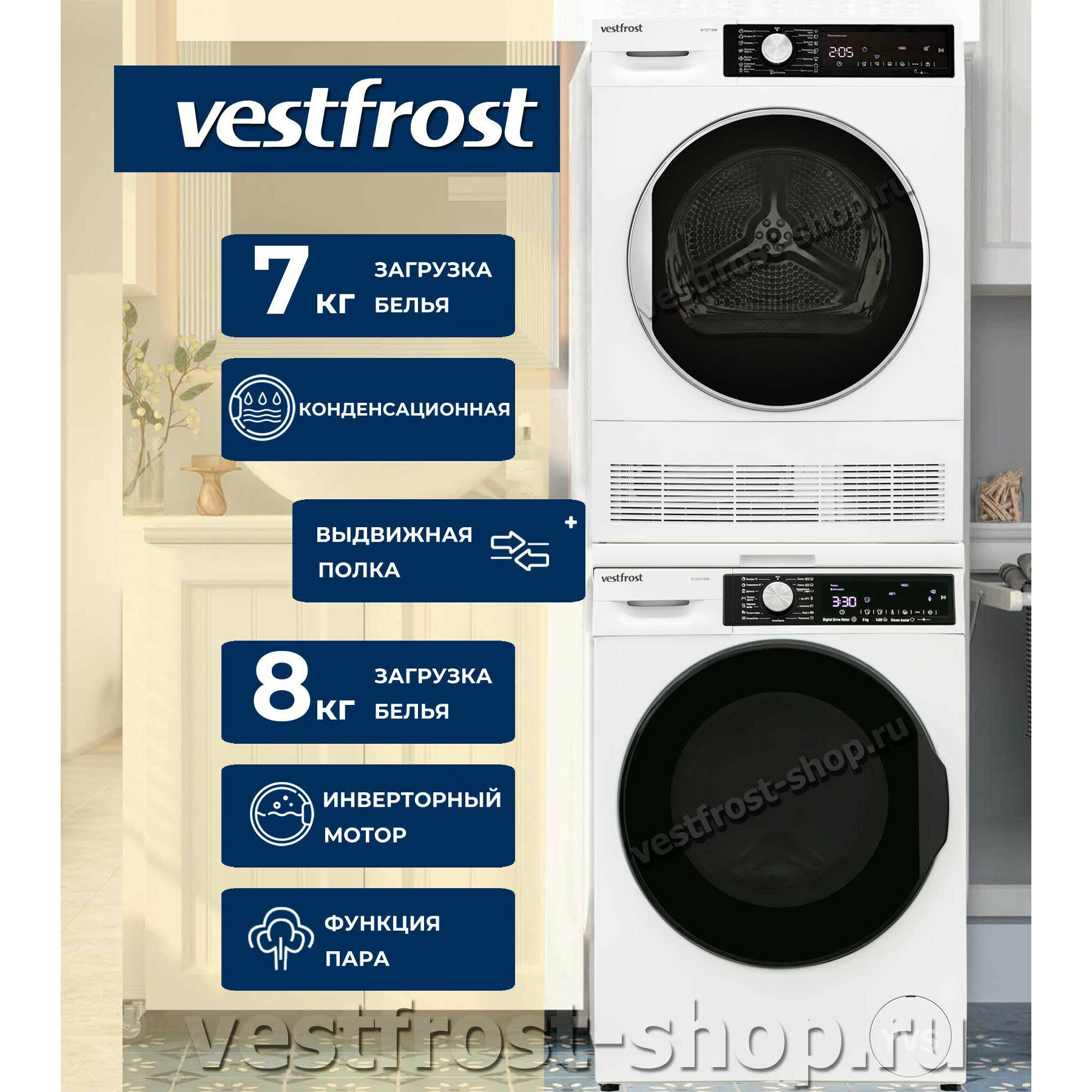 Vestfrost комплект для установки в колонну Стиральная машина VFC814T30W + Сушильная машина VFTD7T30W + Соединительный кит c выдвижной полкой: сравнение цен, характеристики, фото, актуальное наличие и цены.