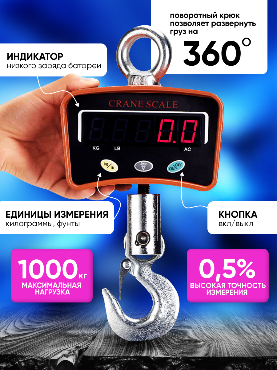 Характеристики: Нагрузка максимальная: 1000 кг Точность измерения: 0,05 % Диапазон рабочих температур: от -30 до 50 °C Поворотный крюк: позволяет развернуть груз на 360 градусов Материал: алюминиевый сплав Дисплей: LCD Питание: 1 * 6 В, батарея 2400 мАч (в комплекте) Время работы без подзарядки: до 120 часов Размер: 38,5x15x10 см
