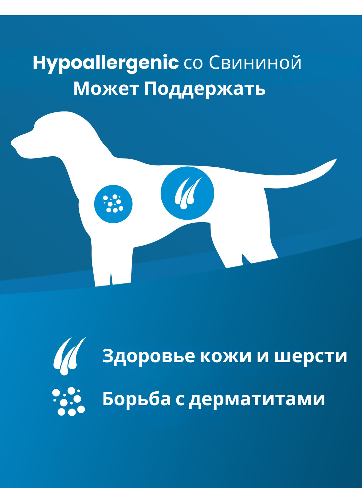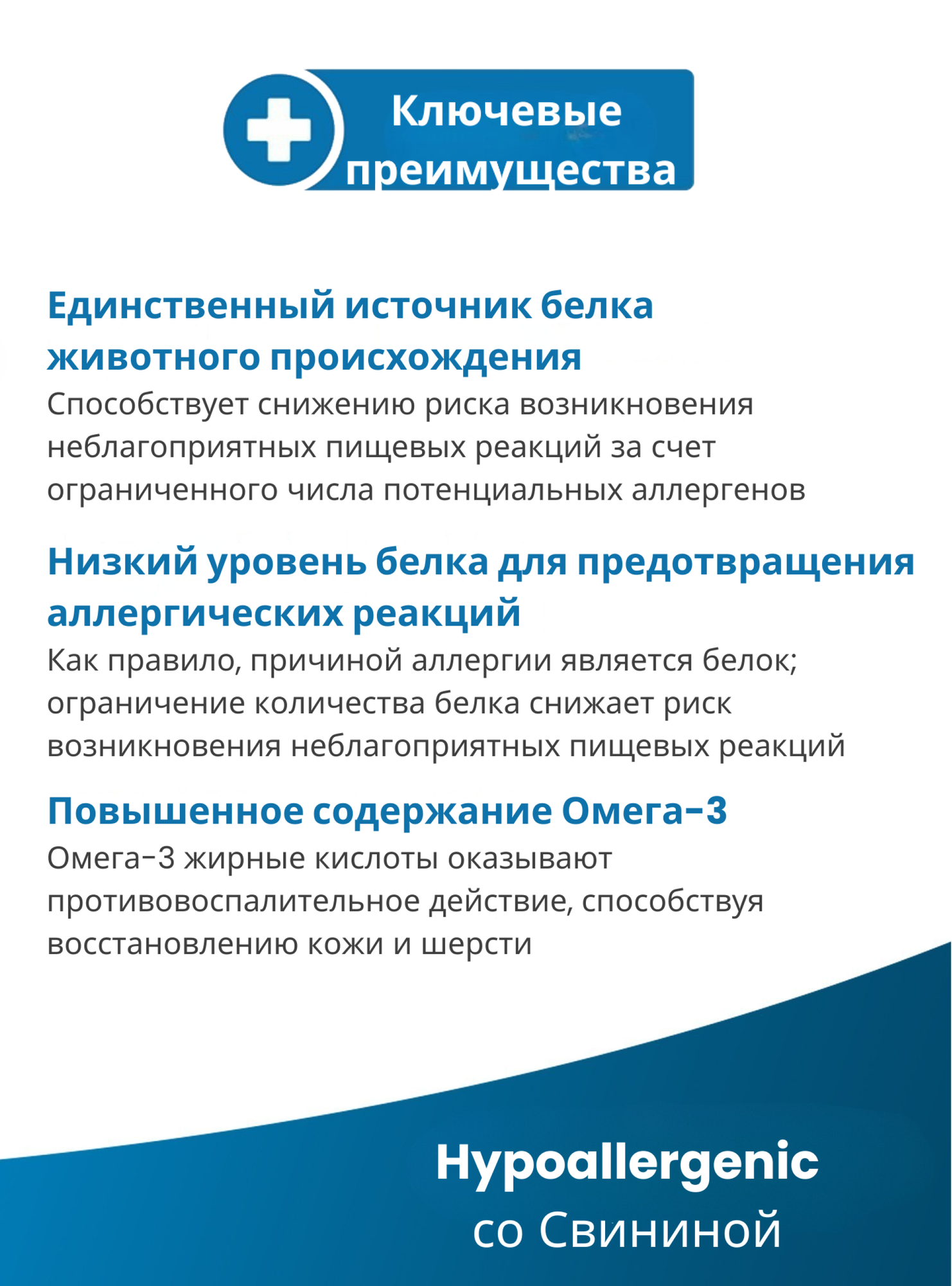 Формула включает свинину как единственный источник животного белка и картофель как единственный источник углеводов, что снижает вероятность возникновения аллергических реакций у чувствительных животных. Омега-3 жирные кислоты оказывают выраженное противовоспалительное действие, способствуя восстановлению кожи и улучшению состояния шерсти. Цинк поддерживает регенерацию тканей и кожно-шерстный покров. Состав сбалансирован по питательным веществам и не содержит распространённых аллергенов.