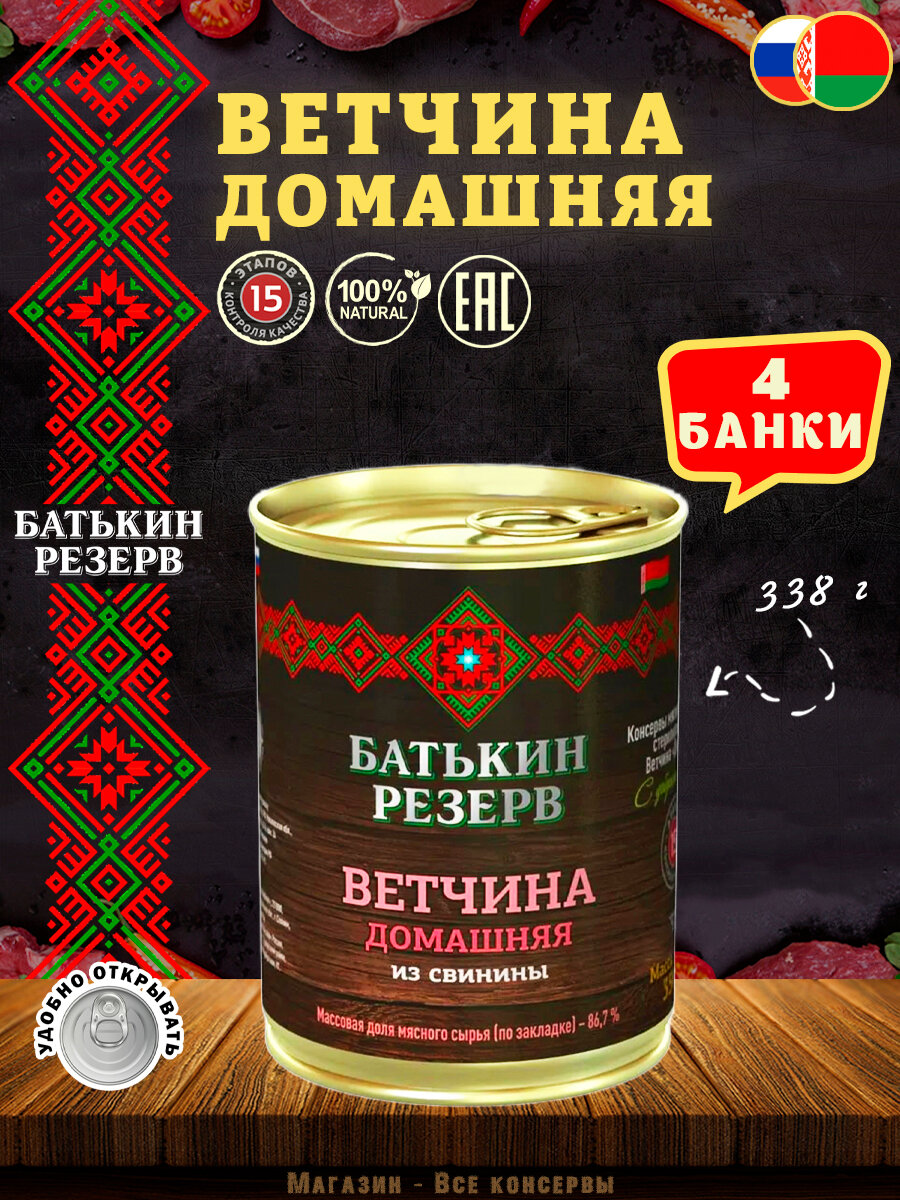 Ветчина домашняя из свинины, Батькин резерв, ТУ, 4 шт. по 338 г: сравнение цен, характеристики, фото, актуальное наличие и цены.